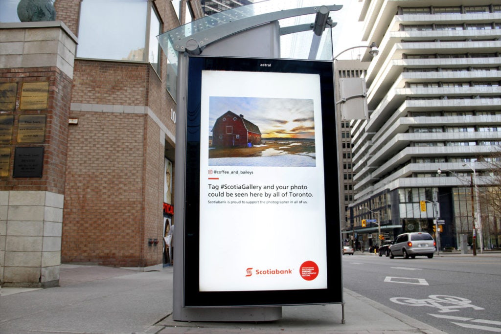 Scotiabank wanted to create a public photo gallery on the streets of Toronto where anyone could have their own images displayed via the #scotiagallery hashtag on Instagram. To do this, Astral developed a flexible moderated tool so that the client could post the images. The selected images were broadcasted on Astral Toronto digital transit shelters and one of Astral’s most prominent vertical digital board on Gardiner.