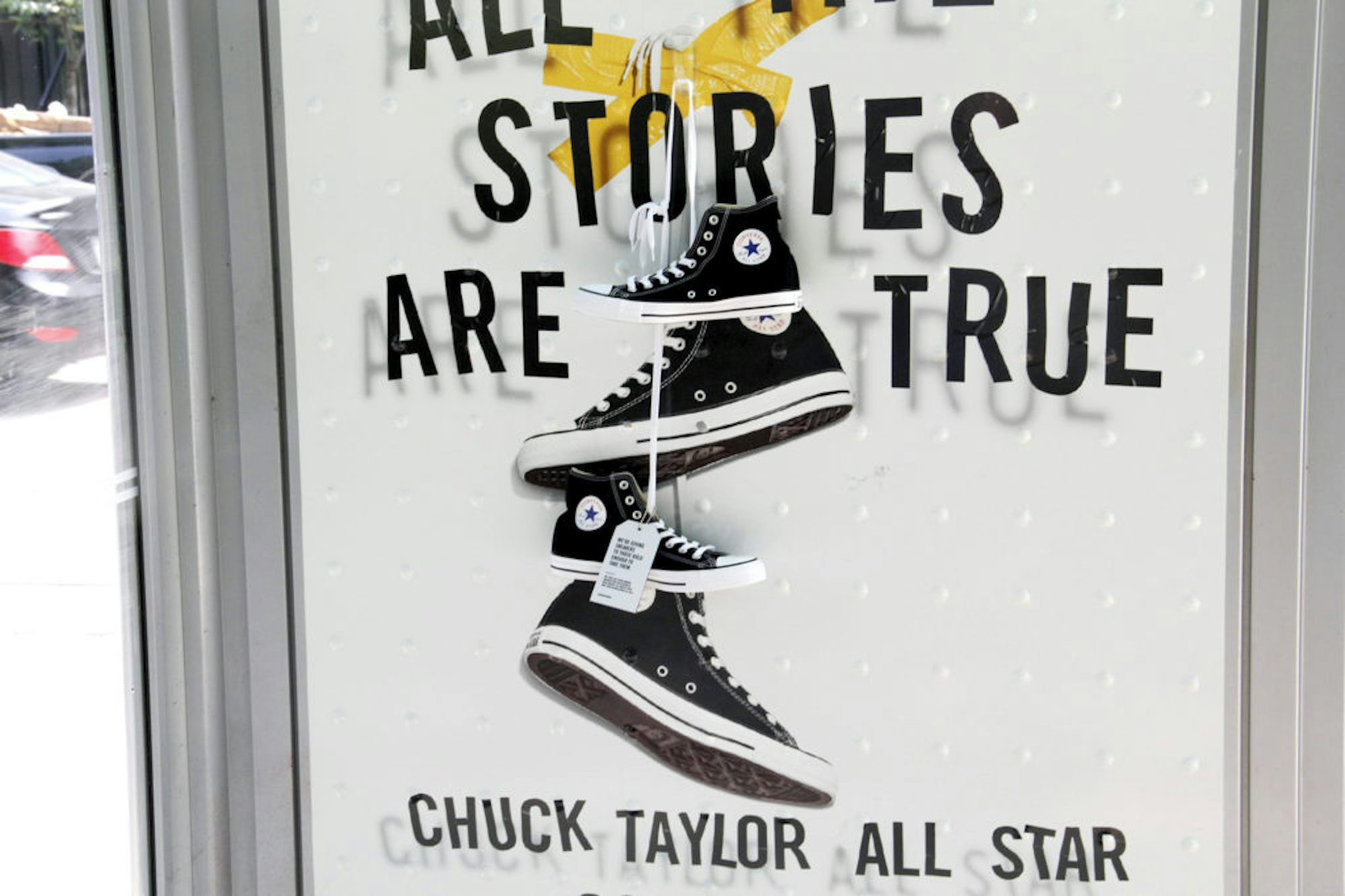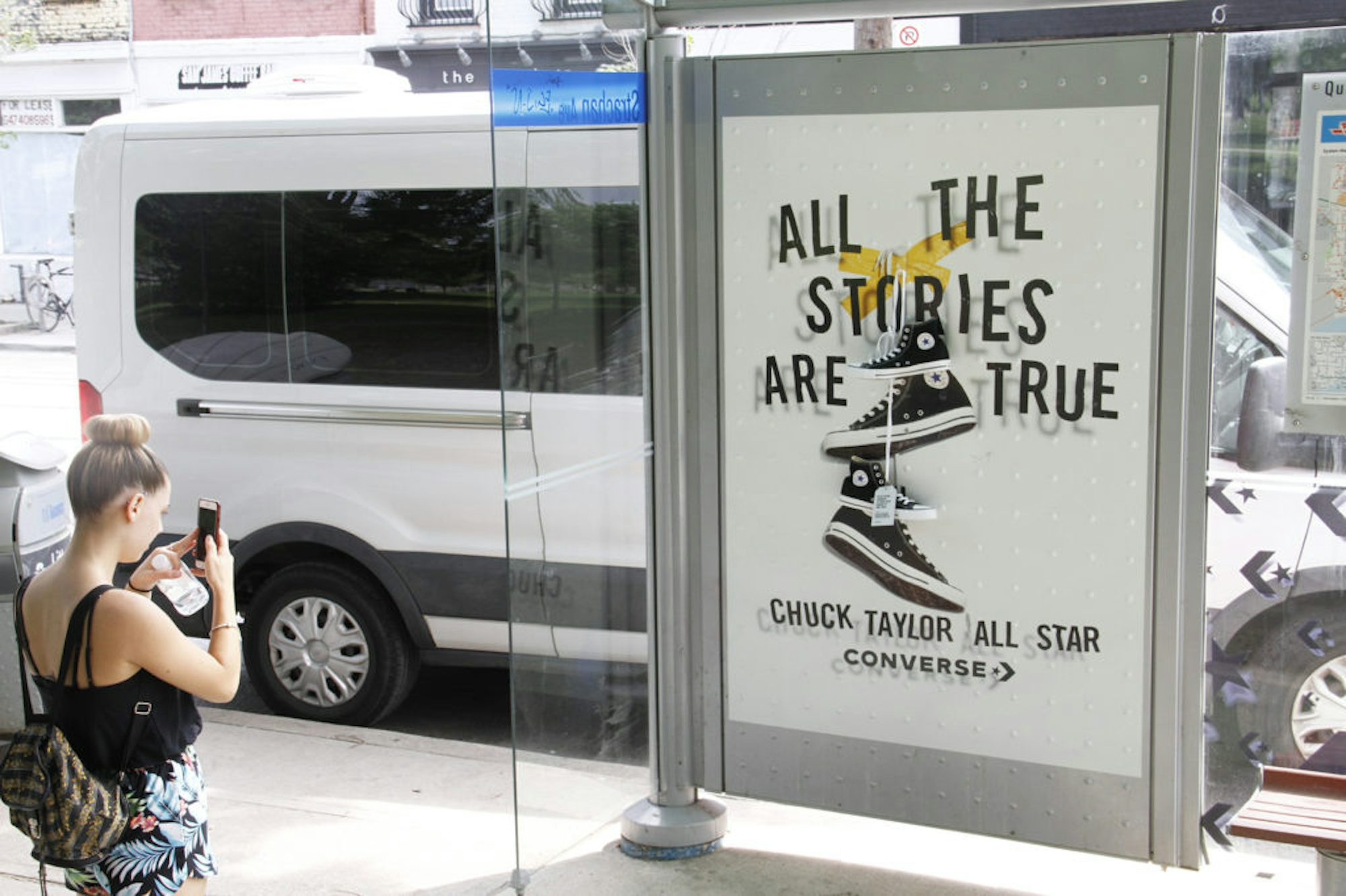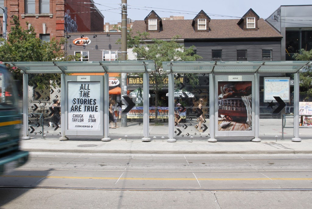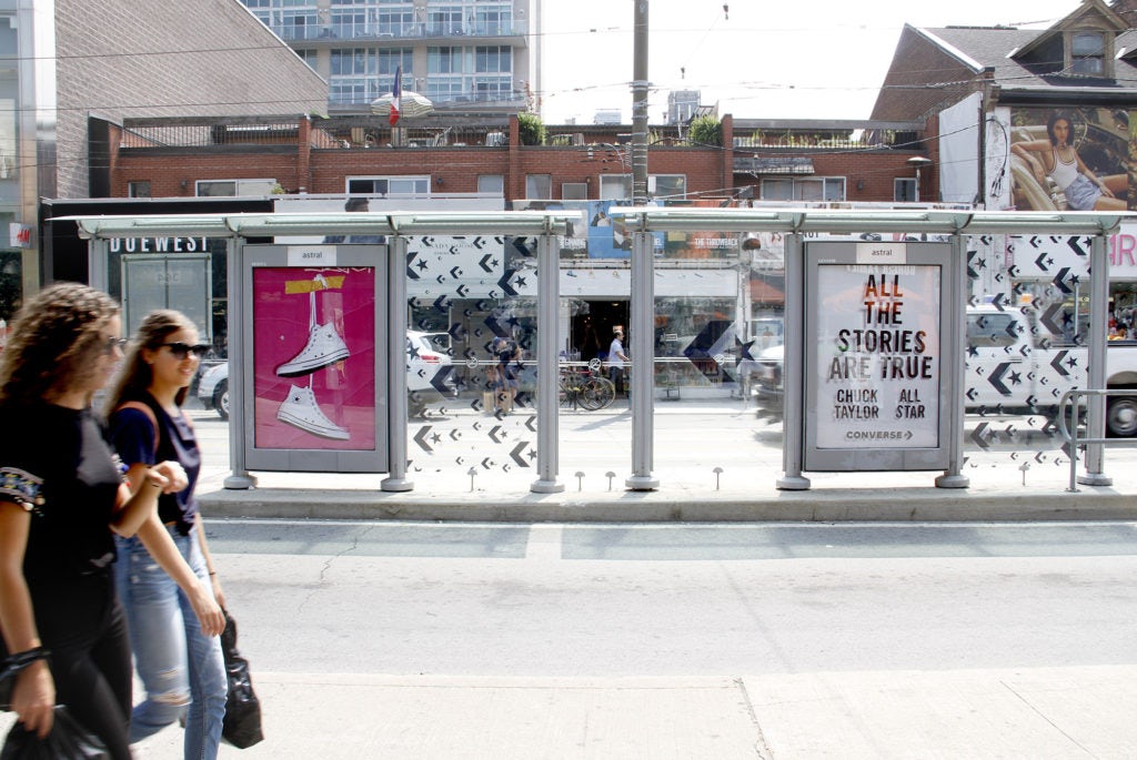 To promote their Chuck Taylor’s brand, Converse gave away free pairs of shoes using Astral Transit Shelters in strategic places in downtown Toronto. The shoes were hung upon a specially wrapped transit shelter face. A tag on the shoes indicated to the lucky person where they could exchange them for a different size if needed. In total, a 100 pair of shoes were given away over a 15 day period at 3 different locations in Toronto.