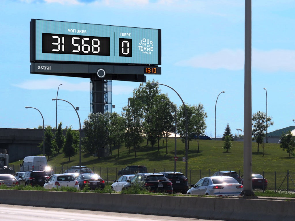 Last April 22 was Earth Day, and lg2 seized the opportunity to display its winning 2018 Carte Blanche for Creatives concept for the Quebec market. Some of Astral’s large format digital billboards were equipped with cameras to monitor the number of cars circulating nearby. Just like in sports competitions, the billboards tallied the score for “Earth vs. Cars”, demonstrating the impact that automobile pollution has on our planet. The pollution tally goes up constantly, while Earth’s score remains stuck at zero.