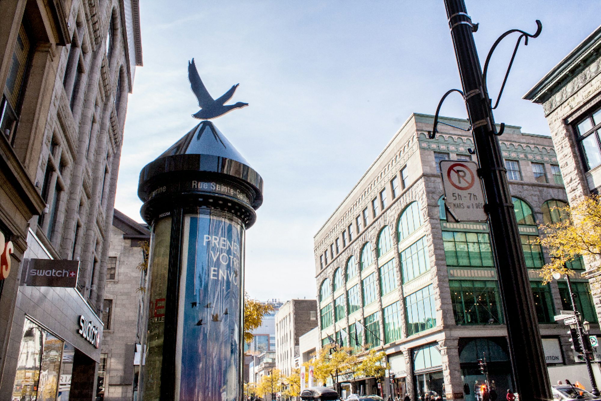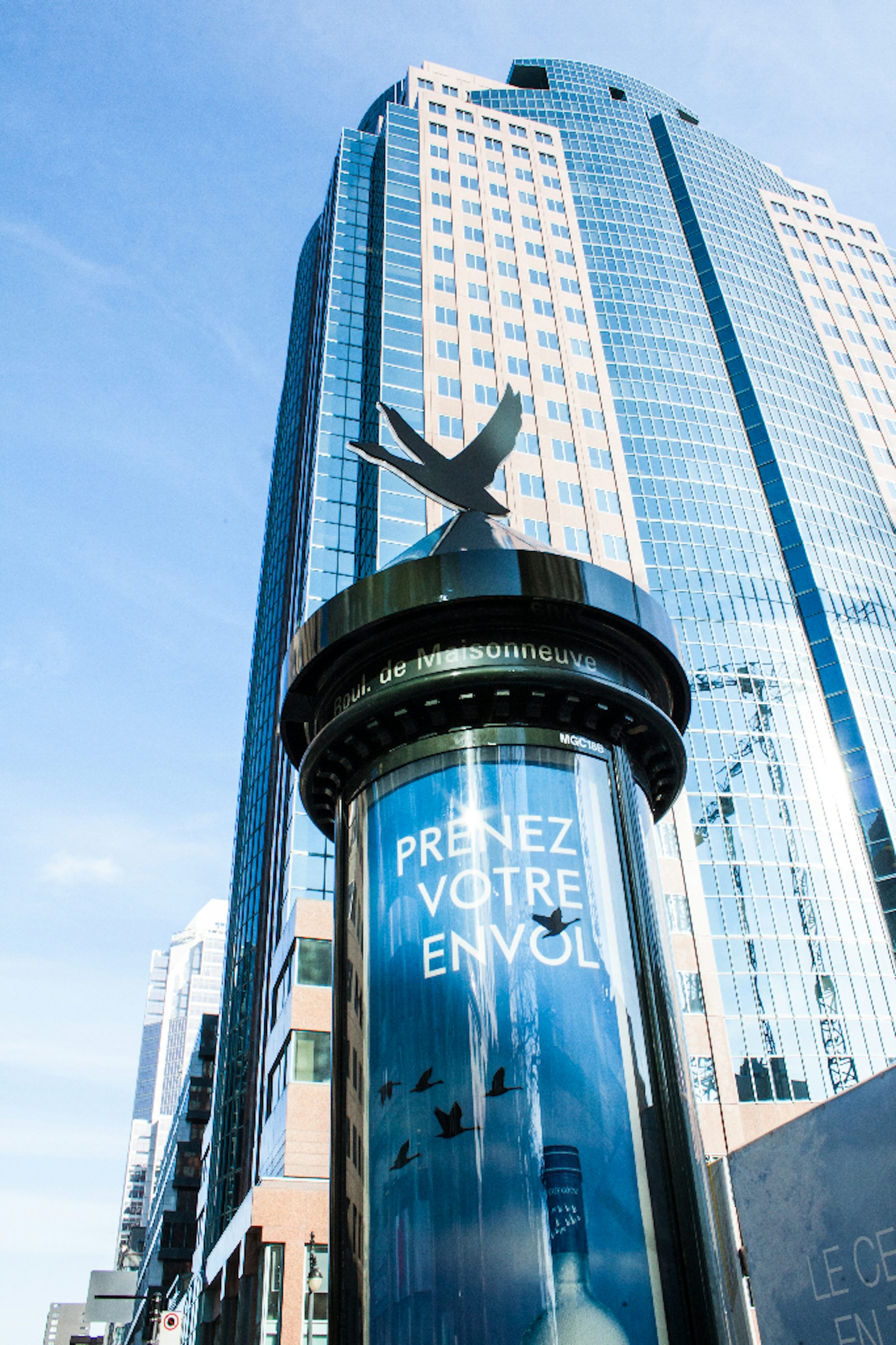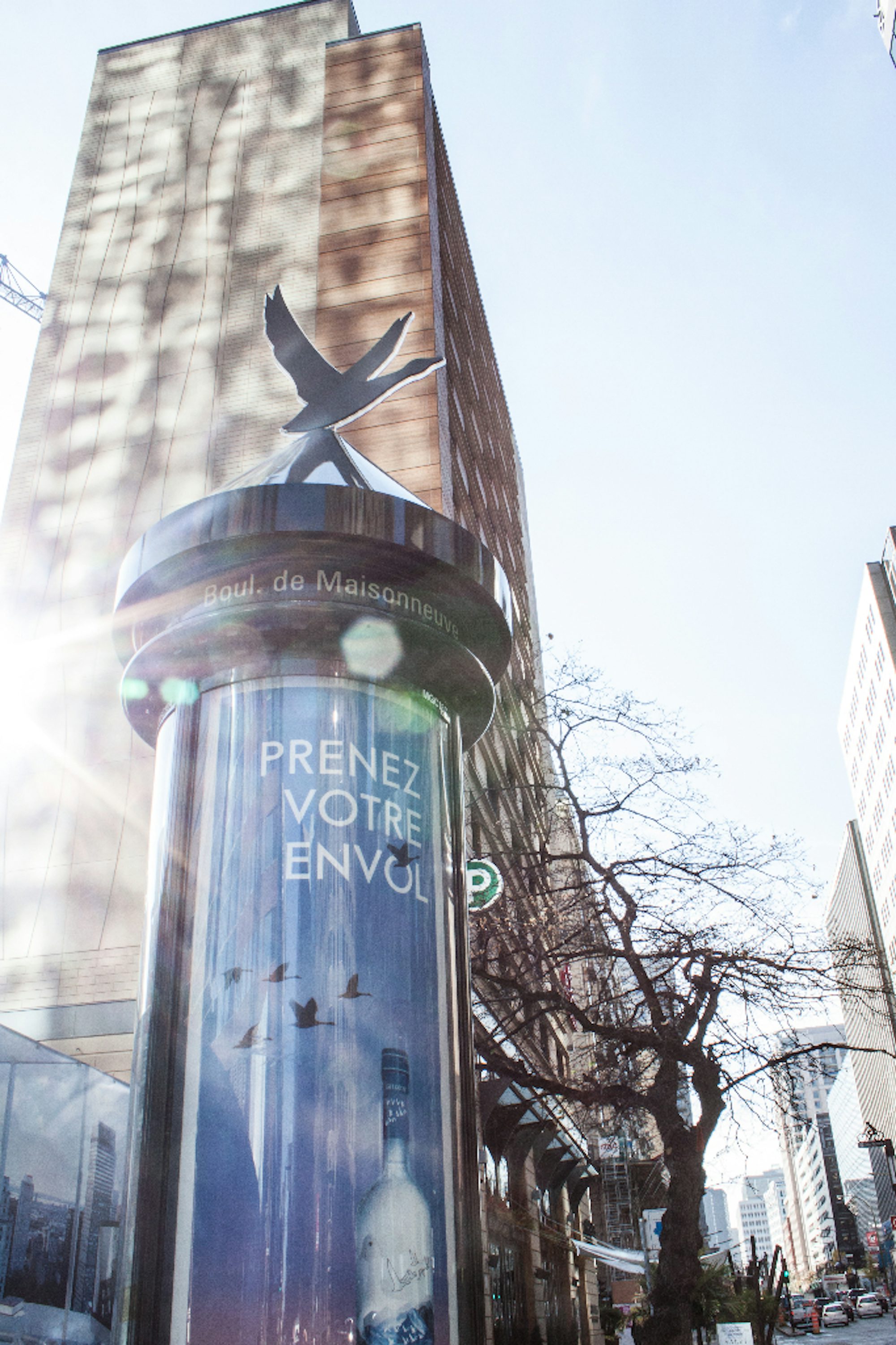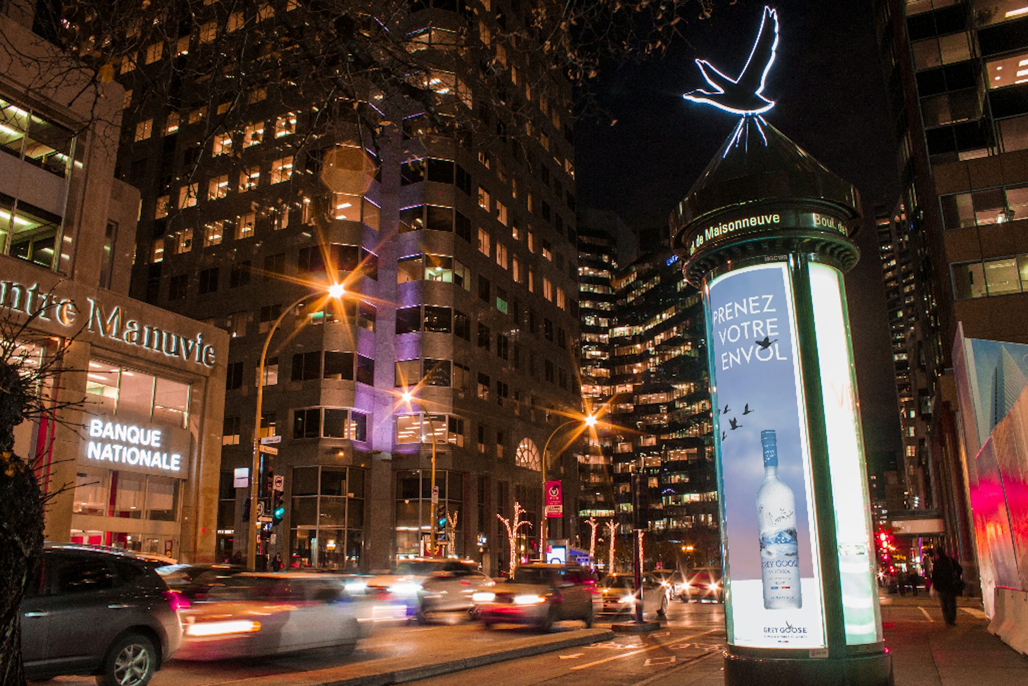 2 MegaColumn sites with LED lit 3D extensions of the Grey Goose bird attached to a cone at the top. The extensions were re-used from their previous campaign that ran during the summer of 2015.