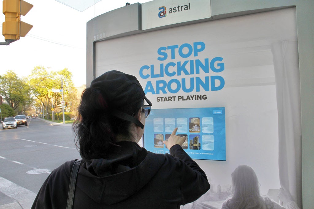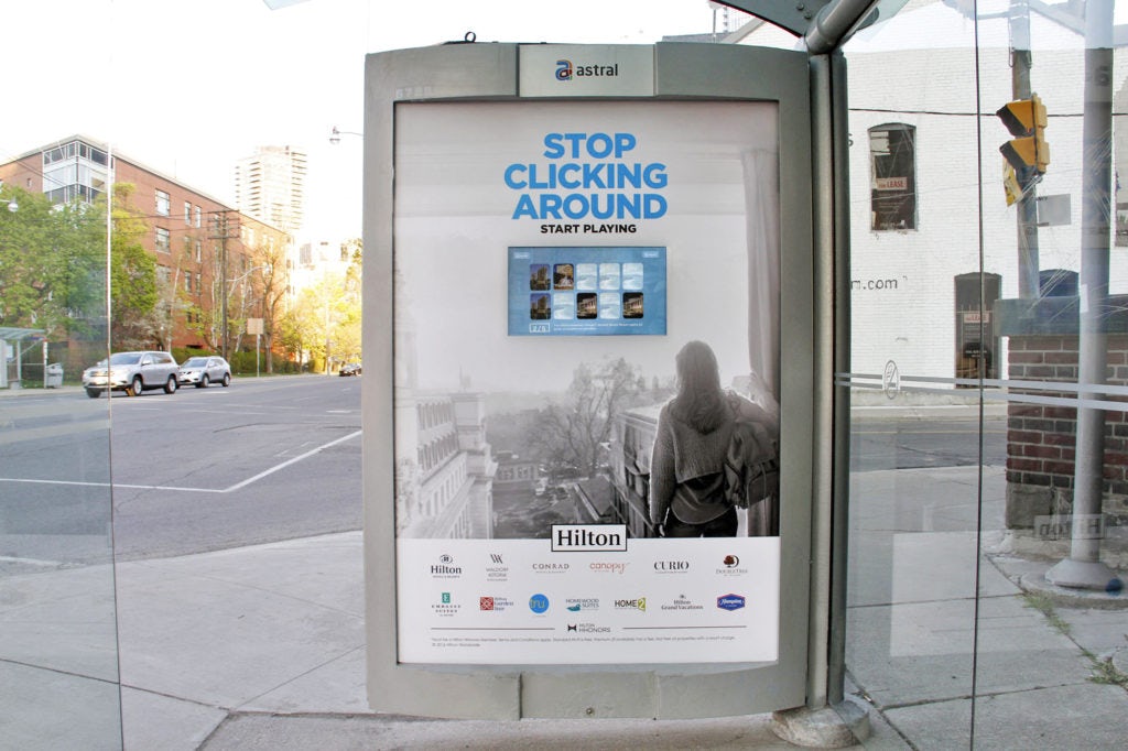 Hilton used the TSA Interactive network in Toronto to encourage consumers to visit Hilton.com for the best rates. The campaign featured a memory game with images of Hilton destinations and the posters surrounding the interactive screen encouraged consumers to book at the Hilton site and free wi-fi at all Hilton resorts.. The campaign included standard transit shelter posters in Toronto and Digital Street Columns in Montreal.