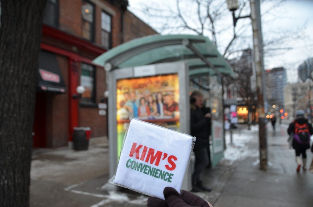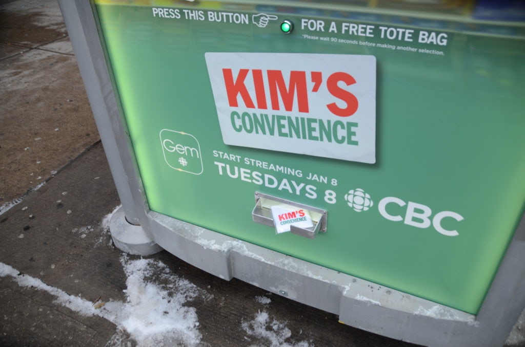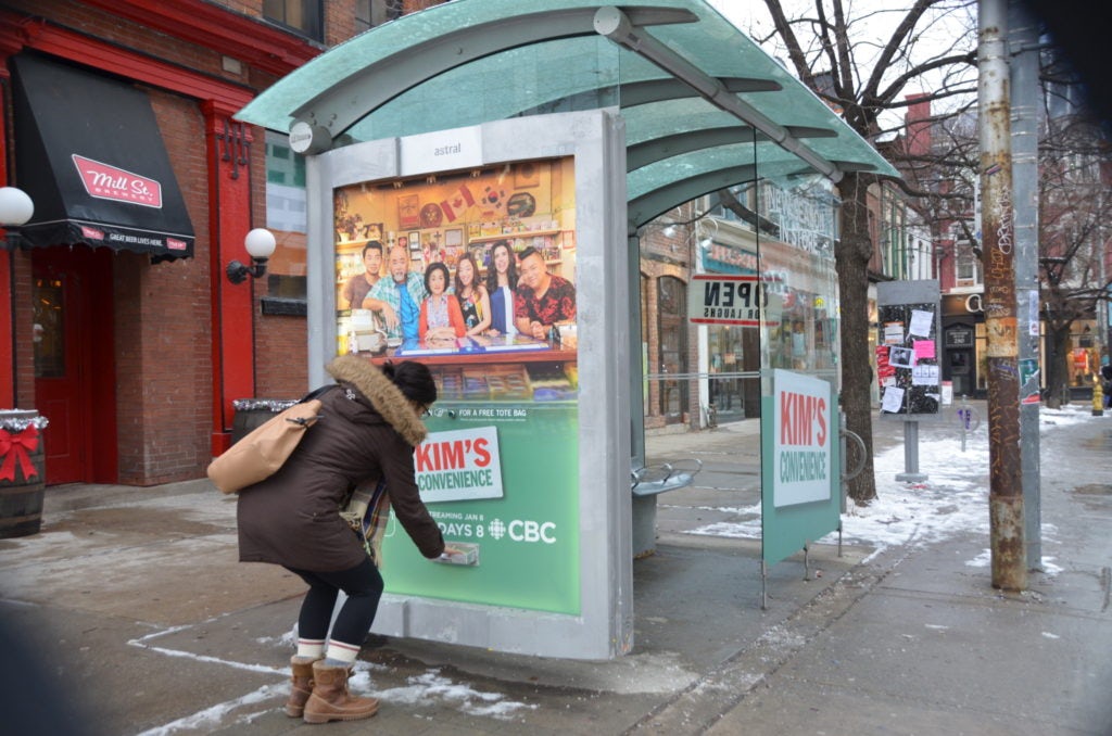 Since 2016, CBC has been broadcasting the famous sitcom “Kim’s Convenience”. To mark the launch of the 3rd season, an advertising campaign was created in order to thank the show’s loyal fans. For 2 weeks during the Holiday season, Astral wrapped transit shelters with show themed vinyl located at the corner of Soho and Queen St W. in Toronto. To further the connection with fans a customized distributor was installed on the external ad face providing transit riders with free Kim’s Convenience shopping bag.
