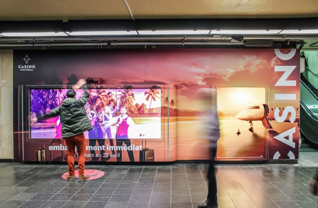 Casino Montreal is in vacation mode and offering an immediate departure to the South! Astral produced a playful campaign at the McGill subway station where people are invited to move their arms around and show off their best dance moves. When passersby walk in front of the mural, Gregory Charles (the casino’s ambassador), begins to play the ukulele. A marker on the floor was placed in front of the digital wall to encourage people to interact with the advertising face. By waving their arms, or perfecting their dance moves on the marker, the characters surrounding Gregory reproduce the gestures in perfect synchronization. At the end of the 30-second choreography, the experience ends and gives way to a message inviting people to the Casino.