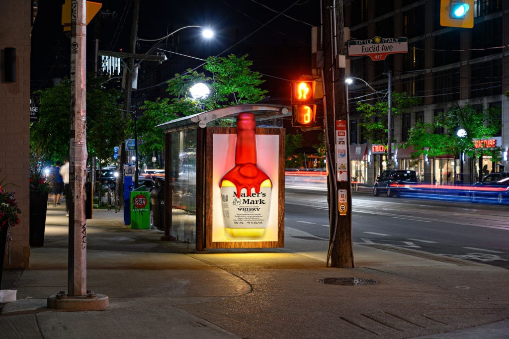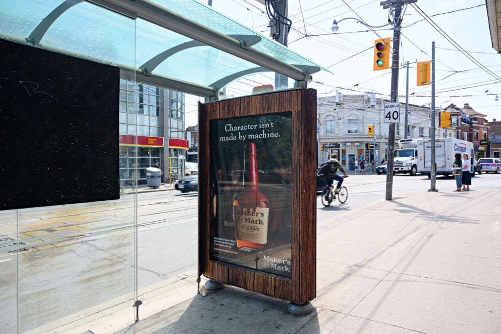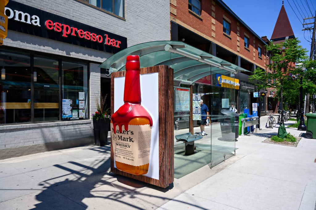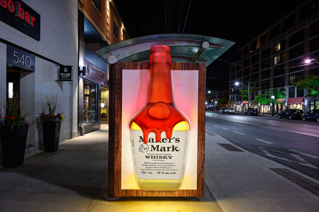 Astral’s Special Project Team created 3 larger than life bottles of the Kentucky Bourbon on TSA faces to help increase awareness in the market. A huge bottle of bourbon popped-out of the outside face of the bus shelters and was illuminated at sundown. The legendary red wax of the Maker’s Mark bottle was also mimicked to give it a more realistic look. On the inside face of the bus shelters, a poster told the story behind the brand’s craftsmanship for the pleasure of consumers that already knew and loved Maker’s Mark but also to reach out to new consumers.