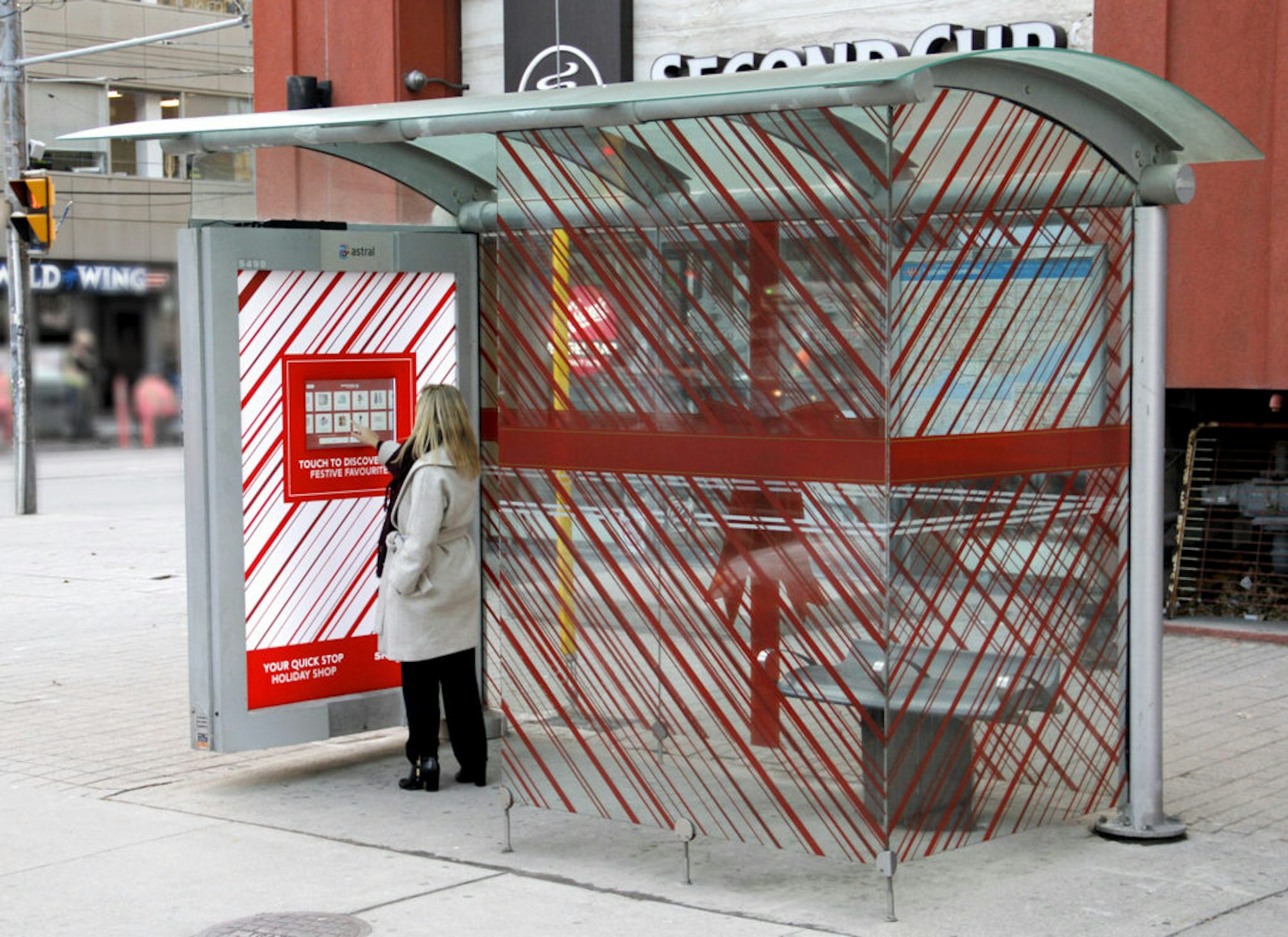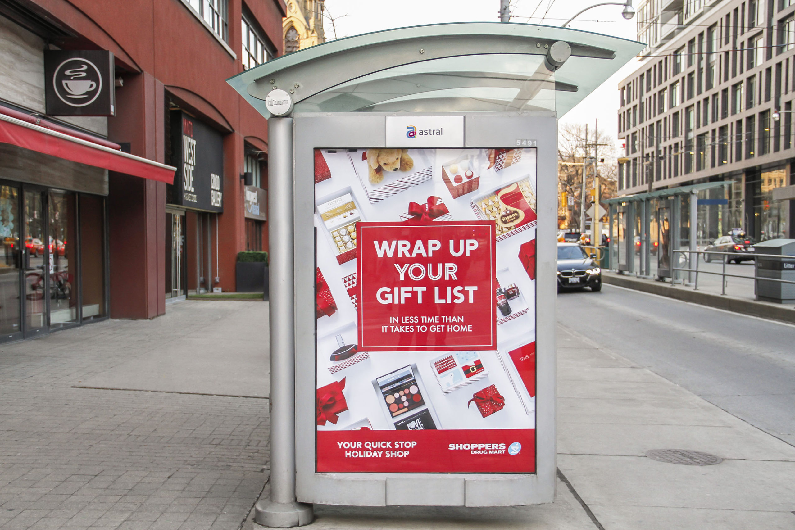 Shoppers Drug Mart used the Astral Out of Home TSA Interactive Network to show consumers how to wrap up their gift lists. This campaign, rounded out with standard transit shelter sites throughout the city of Toronto, featured content that was specific to three dayparts and focused on products by category, time of day, gift-giving, wrapping needs and holiday food items. Consumers were also encouraged to play a matching game that featured a random variety of the featured products. To draw attention to the execution, each of the transit shelters featured red-striped decals to represent festive wrapping paper and big red bows.