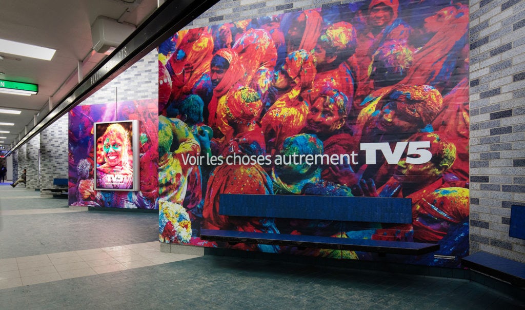 To promote TV5’s artistic programming, subway platform murals with integrated backlit posters were used in the Montreal Subway system. The colourful corner murals on the platform at Place-Des-Arts subway station promoted the TV station’s tag line “See things differently”.