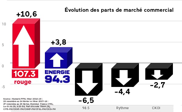 Numeris (PPM), Hiver 2019 (13 sem) / Hiver 2018 (13 sem) / « à vie »: depuis le lancement de Rouge fm à l’automne 2011/ ÉNERGIE à l’automne 2015 basé sur les sondages 13 sem. (excluant ceux d’été, non commerciaux à Montréal)