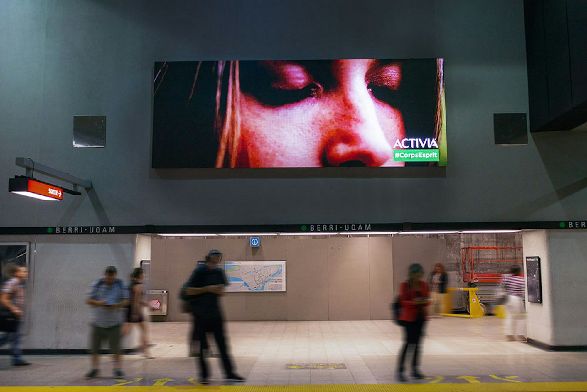 Chaque été, Montréal est l’hôte d’un grand rassemblement de yoga. Danone, en collaboration avec l’agence Carl, voulait profiter de cet évènement qui fait la promotion d’un corps et d’un esprit sain pour promouvoir ses produits Activia. L’équipe des projets spéciaux d’Astral, Wavemaker et l’agence Carl ont développé une campagne d’affichage dynamique sur le nouveau réseau numérique de la station Berri-UQAM. Ainsi, à l’arrivée de chaque voiture métro, un message s’affichait sur les écrans et différents visuels de la campagne défilaient. D’autres vidéos étaient aussi projetées en attendant la prochaine voiture. Pour attacher le tout à la thématique du yoga, le sol devant les quatre écrans de la station était recouvert de faux tapis de yoga vert, la couleur dominante de la marque Activia.