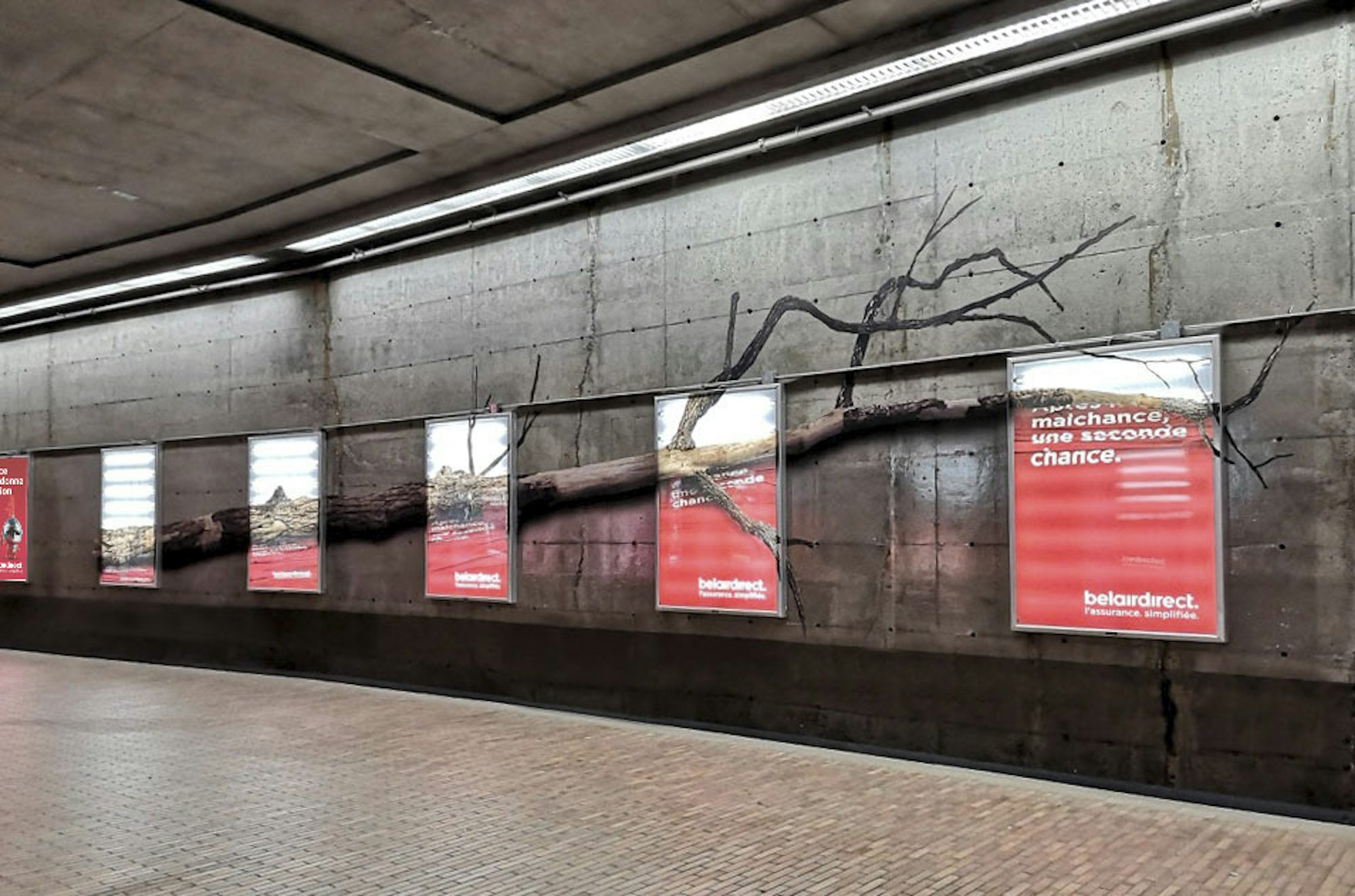 Des créatifs percutants, comme une énorme branche d’arbre qui tombe sur un super panneau ou encore un feu qui ravage les affiches en dominance à la station de métro Montmorency et au terminus du 1 000 de la Gauchetière simulaient des cas réalistes de possibles recours à l’assurance – et où La police qui pardonne pourrait aider les sinistrés.