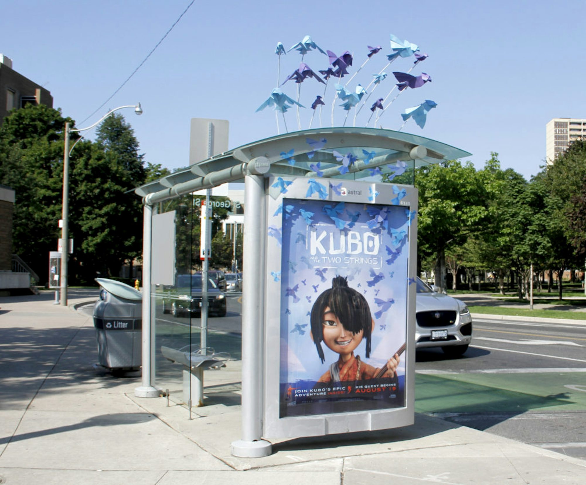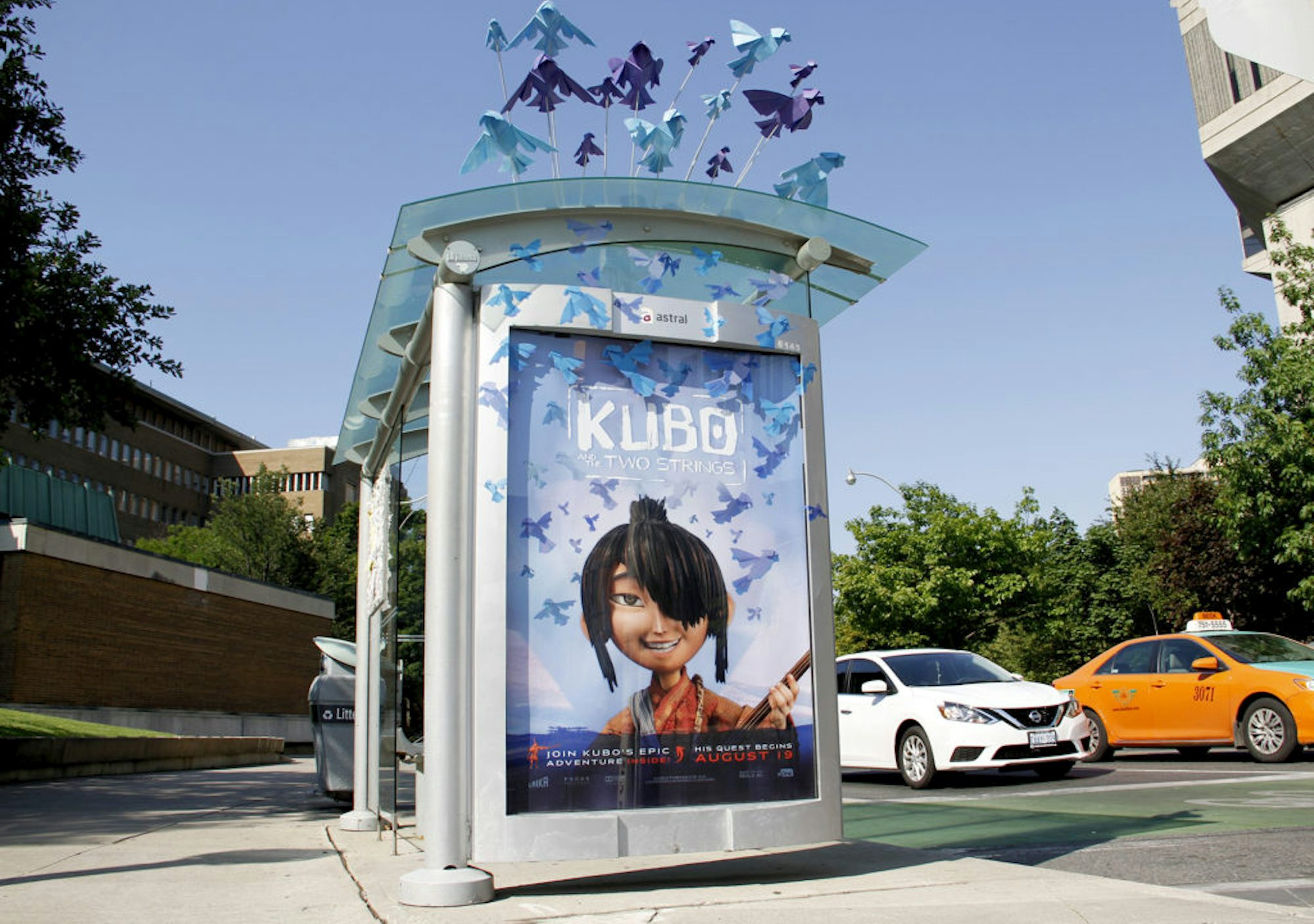 Sur les sept abribus interactifs au coeur de Toronto, EOne films offrait aux passants l’occasion de voir la bande annonce du film « Kubo » et de jouer à un jeu inspiré de ses personnages. De plus, sur trois sites triés sur le volet, des oiseaux en origami tridimensionnels étaient installés sur le toit de l’abribus, afin de capter l’attention davantage.