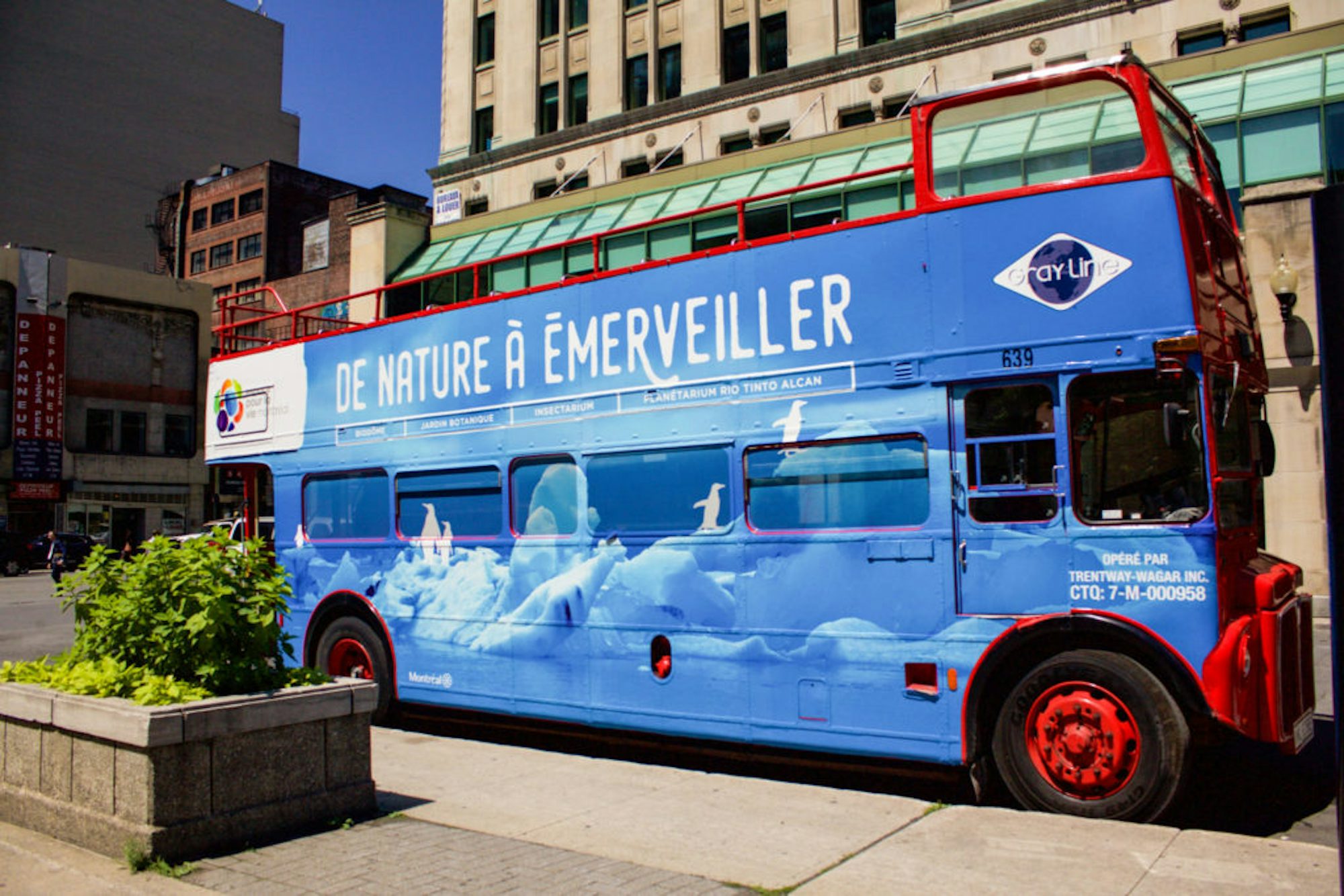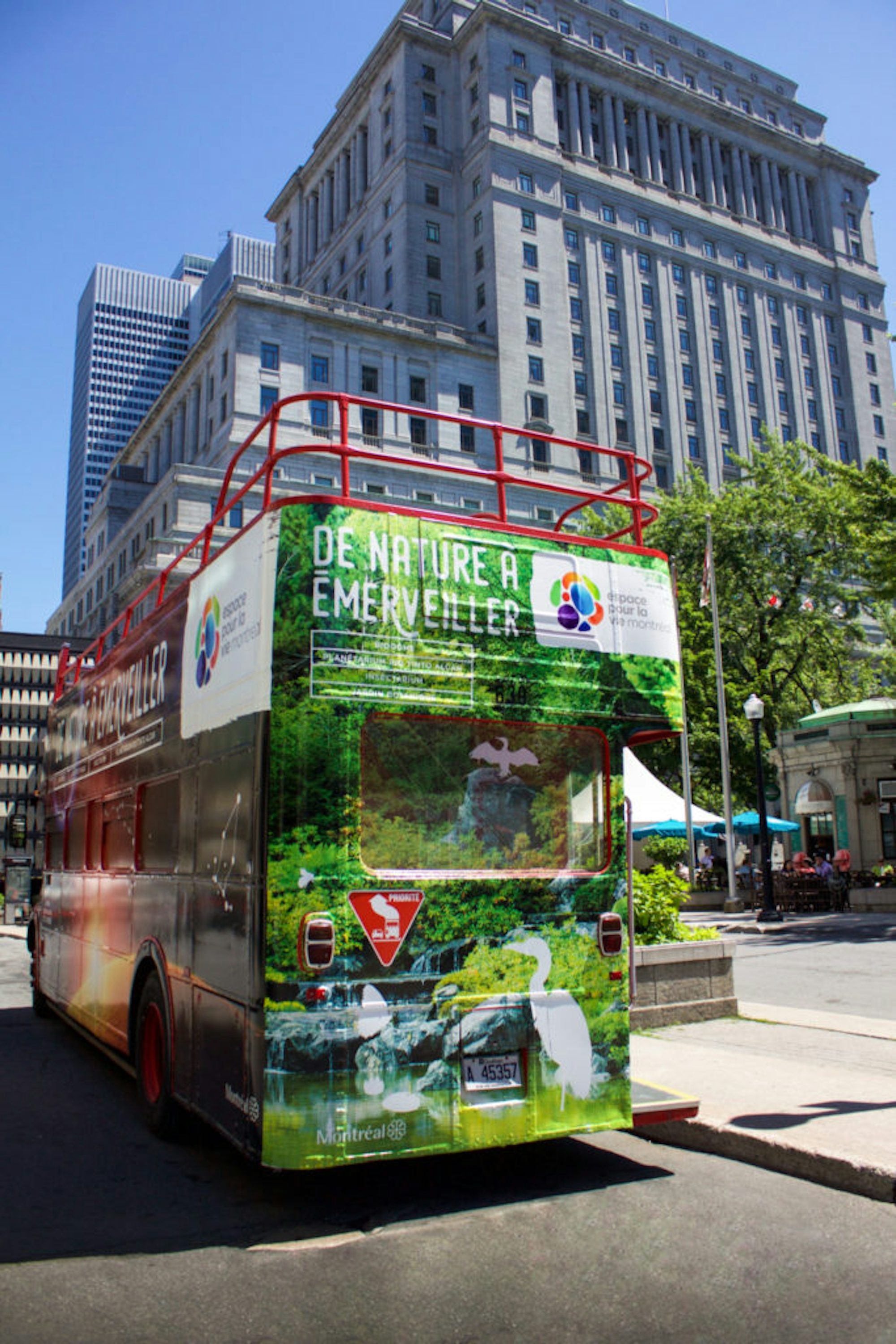 Avec ce Double Decker, la Ville de Montréal fait la promotion du Biodôme, du Jardin Botanique, du Planétarium et de l’Insectarium de Montréal.