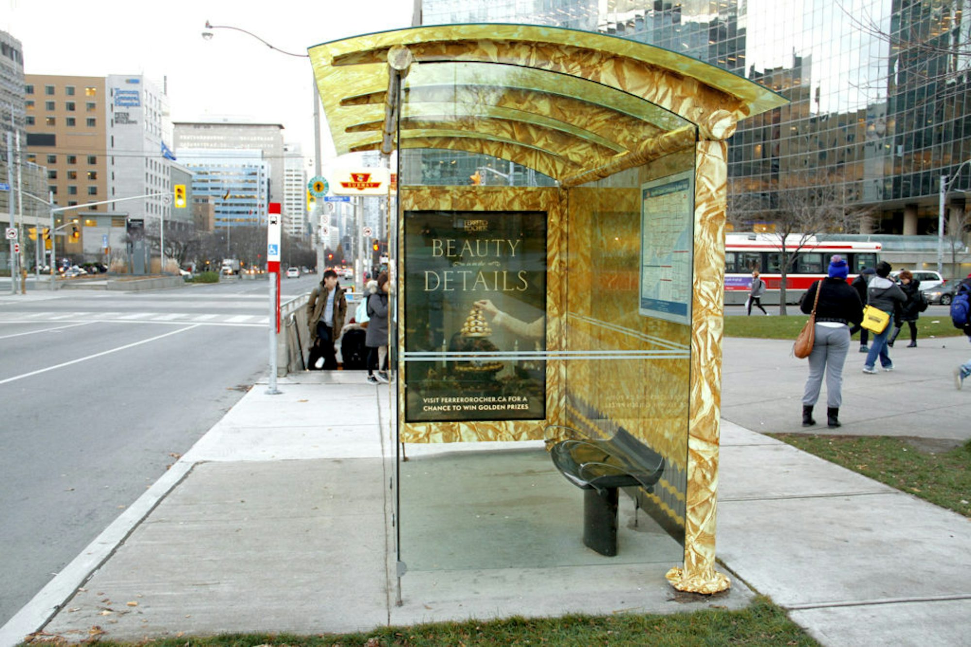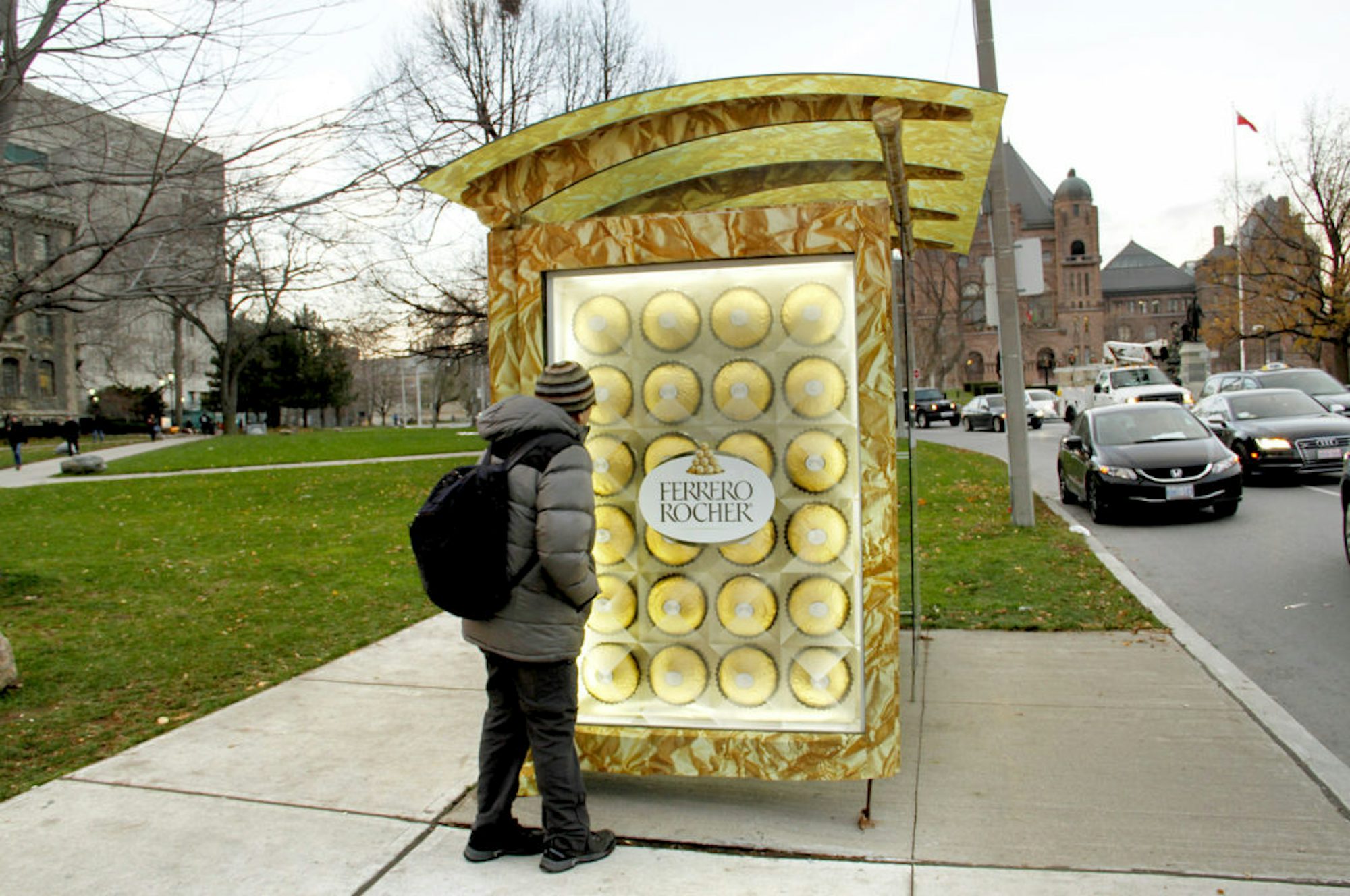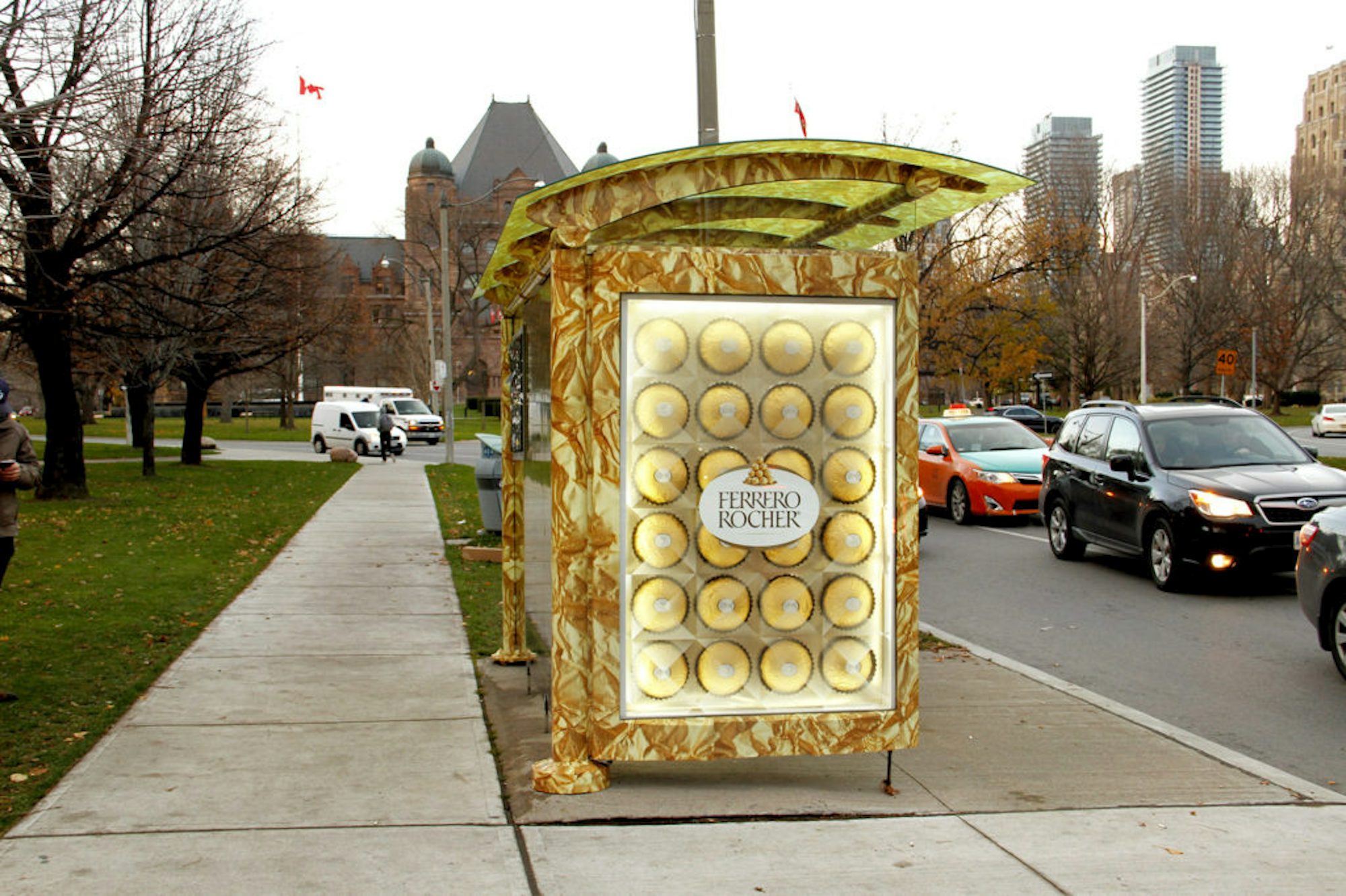 2 abribus enveloppés de vinyle qui leur donne un aspect texturé et doré. Des chocolats 3D illuminés par des lumières DEL ont été placés à l’intérieur des faces d’affichage. Le banc à l’intérieur de l’abribus est couvert d’un vinyle brun chocolat.