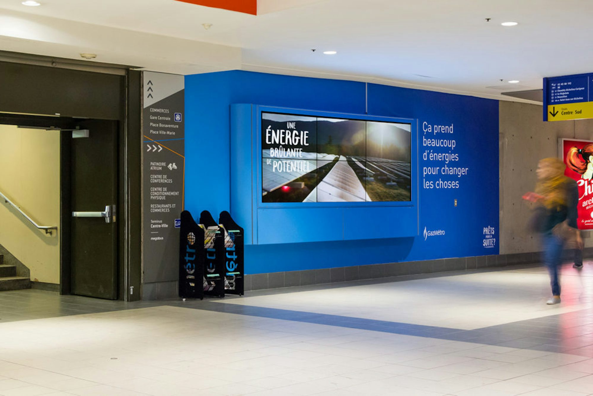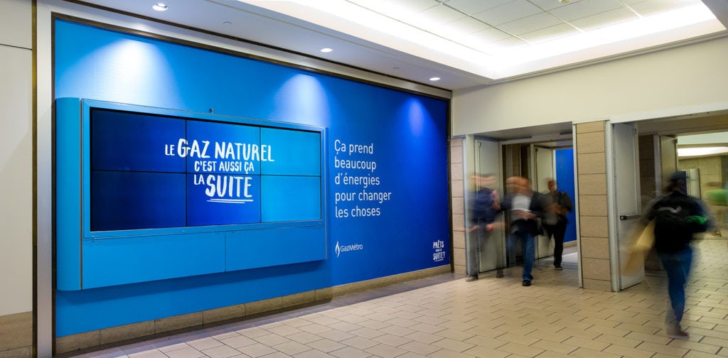 Afin de mettre de l’avant l’utilisation écologique des énergies renouvelables et du gaz naturel, Gaz Métro a fait appel à Astral Affichage. Au total, 6 murales numériques ont été maquillées dans le métro de Montréal, au 1000 de la Gauchetière ainsi qu’à la Gare Centrale.