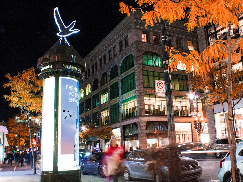 2 MégaColonnes avec extensions 3D de l’oiseau Grey Goose illuminées en DEL attachées au sommet des colonnes. Ces extensions avaient été utilisées dans le cadre d’une campagne précédente pour Grey Goose à l’été 2015.