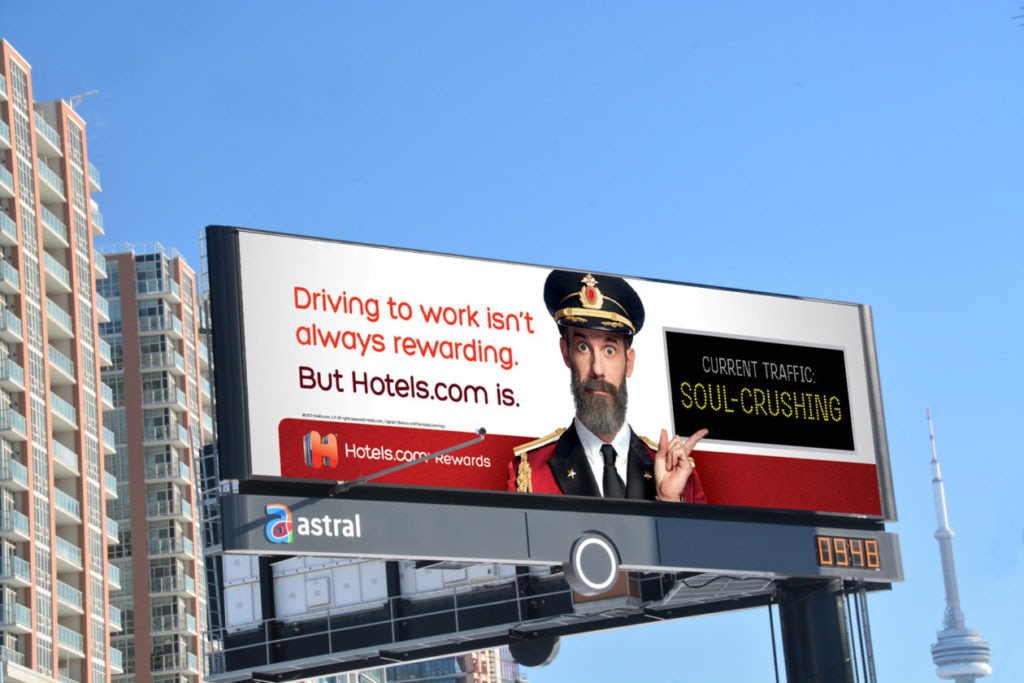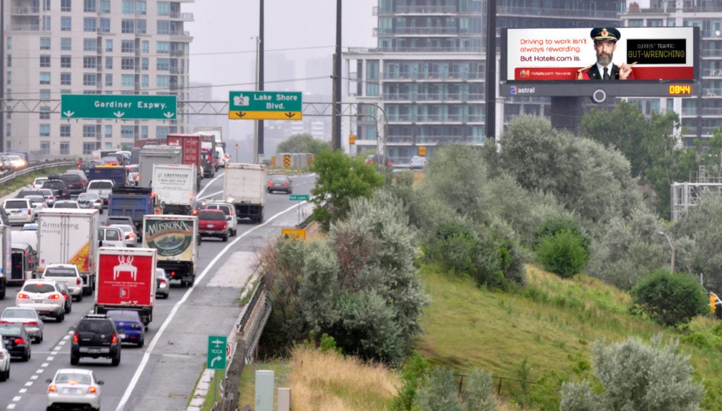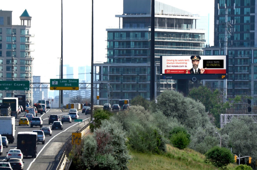 En collaboration avec le service Momentum d’Astral Affichage, Hotels.com a créé une campagne publicitaire dynamique affichant l’état actuel de la circulation sur deux panneaux numériques grand format afin de faire la promotion de son service en ligne pour la saison estivale. La première face se trouvait sur l’autoroute Gardiner et rejoignait les automobilistes des banlieues de l’ouest de Toronto. La deuxième se trouvait sur l’autoroute transcanadienne, près du pont Iron Workers Memorial, à proximité du centre-ville de Vancouver.
