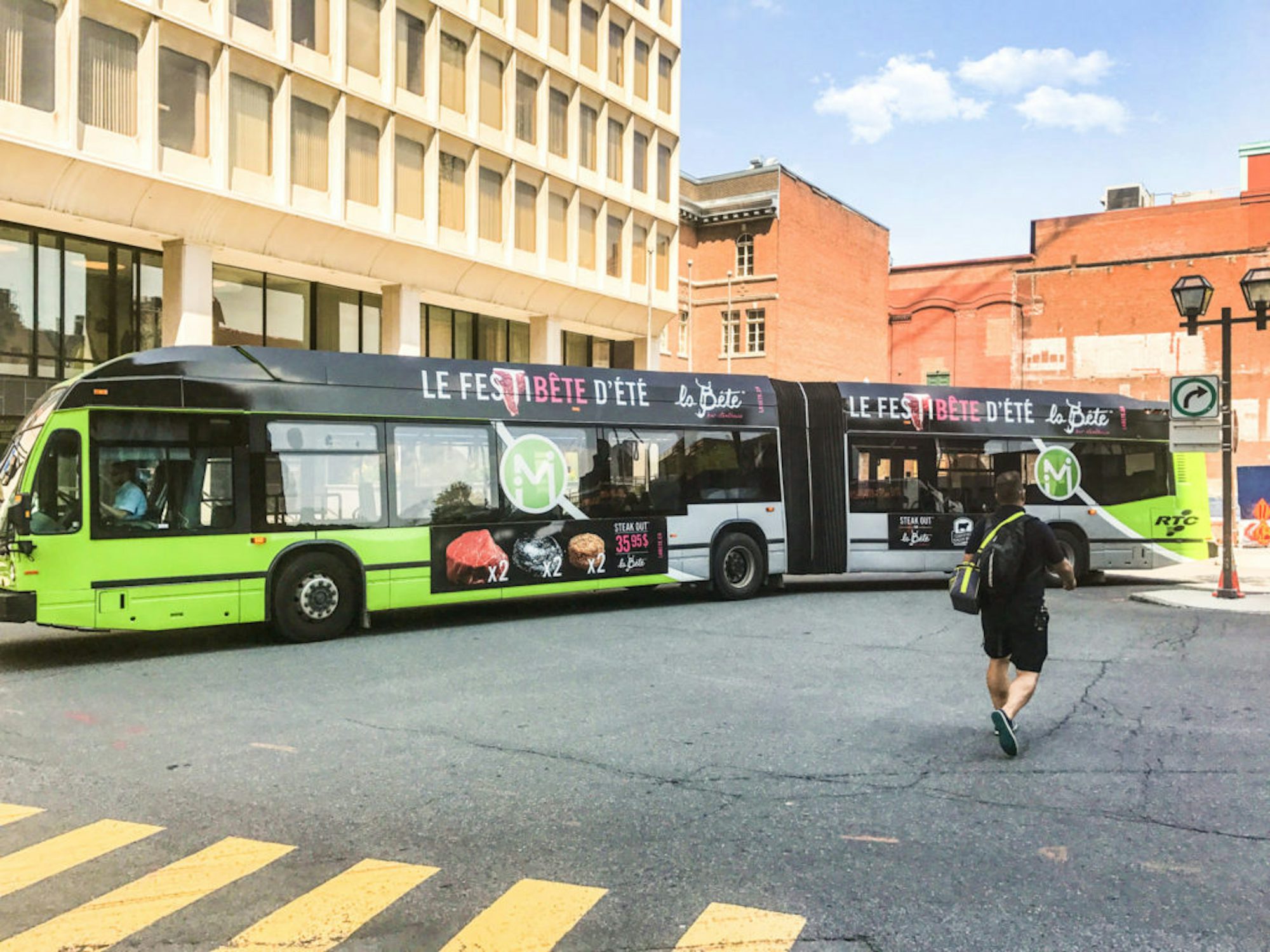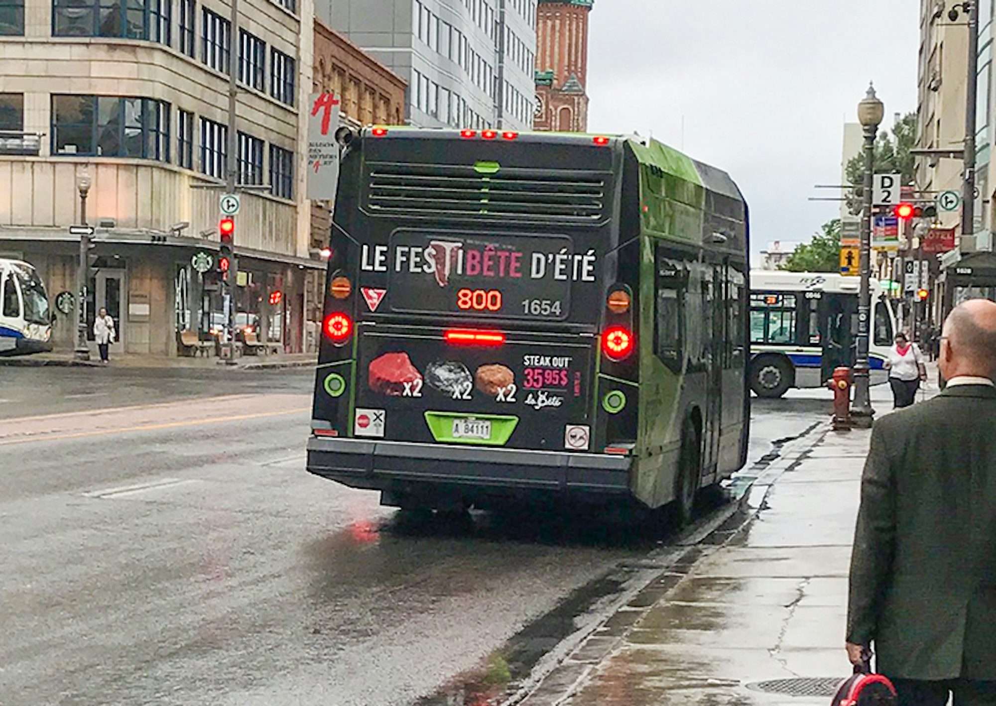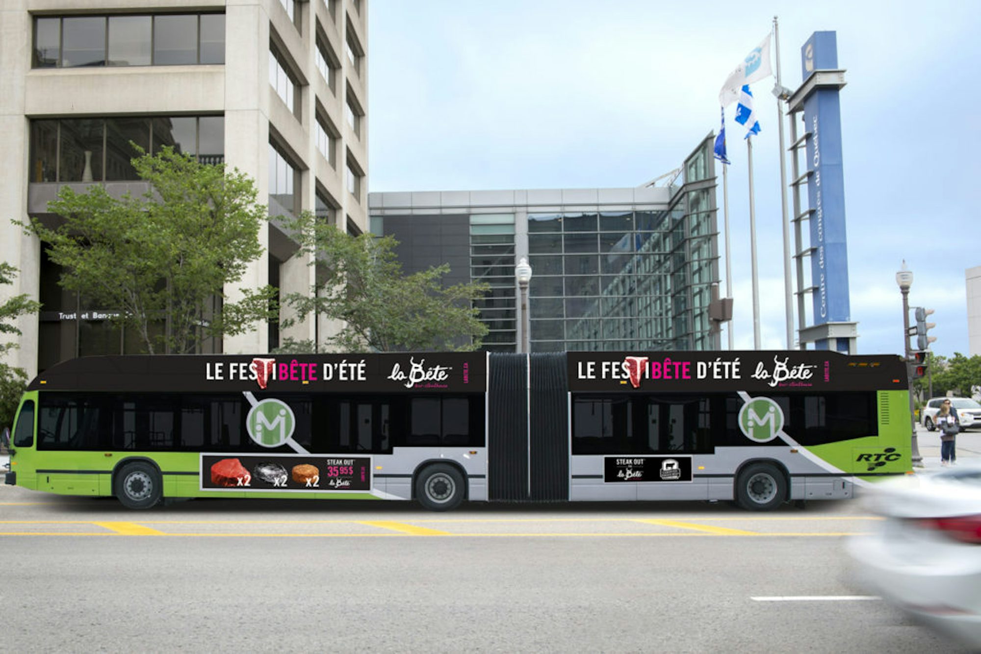En misant sur un maquillage sur le côté et sur le dos de l’autobus articulé, ainsi qu’un panobus côté, La Bête cherchait à faire la promotion de son service de prêt-à-manger pour emporter.