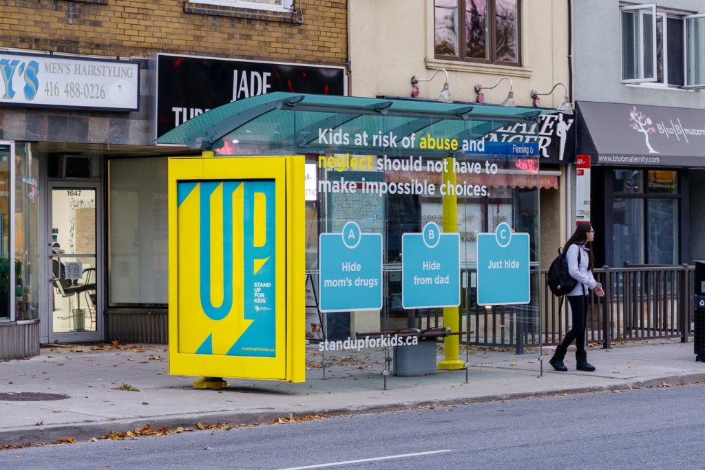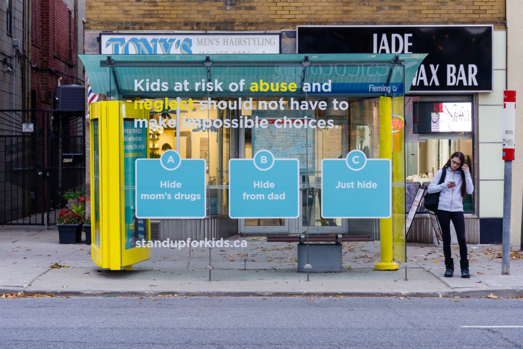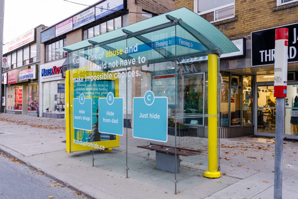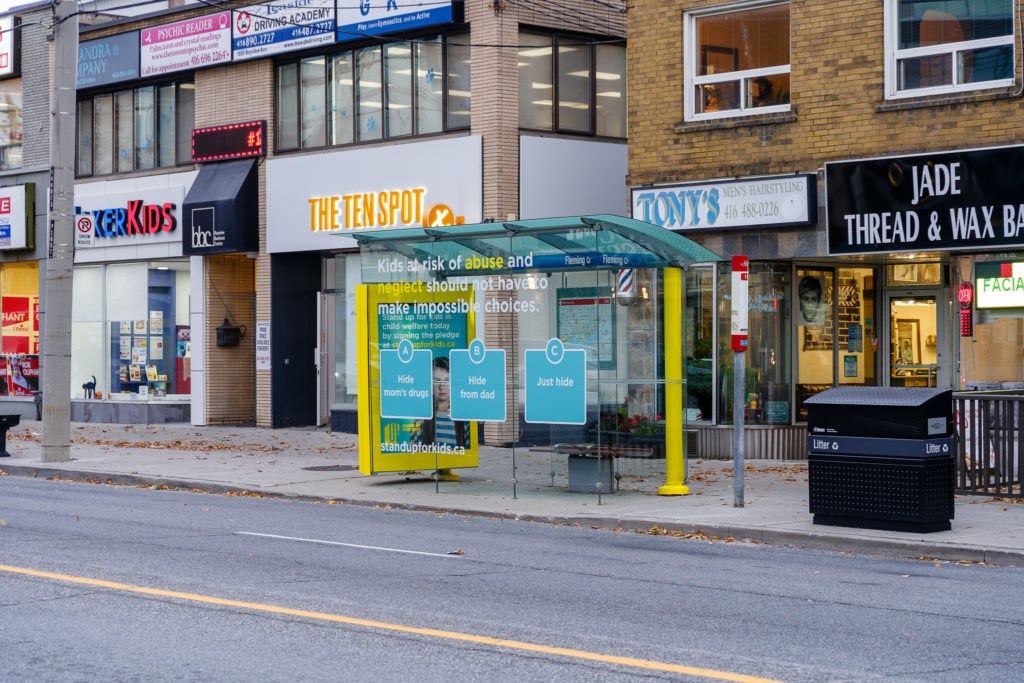 Nos abribus, à différents endroits dans la Ville reine, ont été maquillés. Les créatifs illustraient des scénarios inimaginables auxquels certains enfants vivant dans des environnements abusifs et de négligence sont confrontés quotidiennement. Les messages clés sur le Web et en affichage visaient à générer du trafic sur le site Web de la Fondation pour que les gens fassent un don et signent la promesse d’aide pour redonner à ces enfants une vie « normale ».