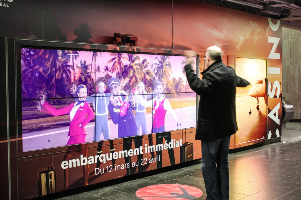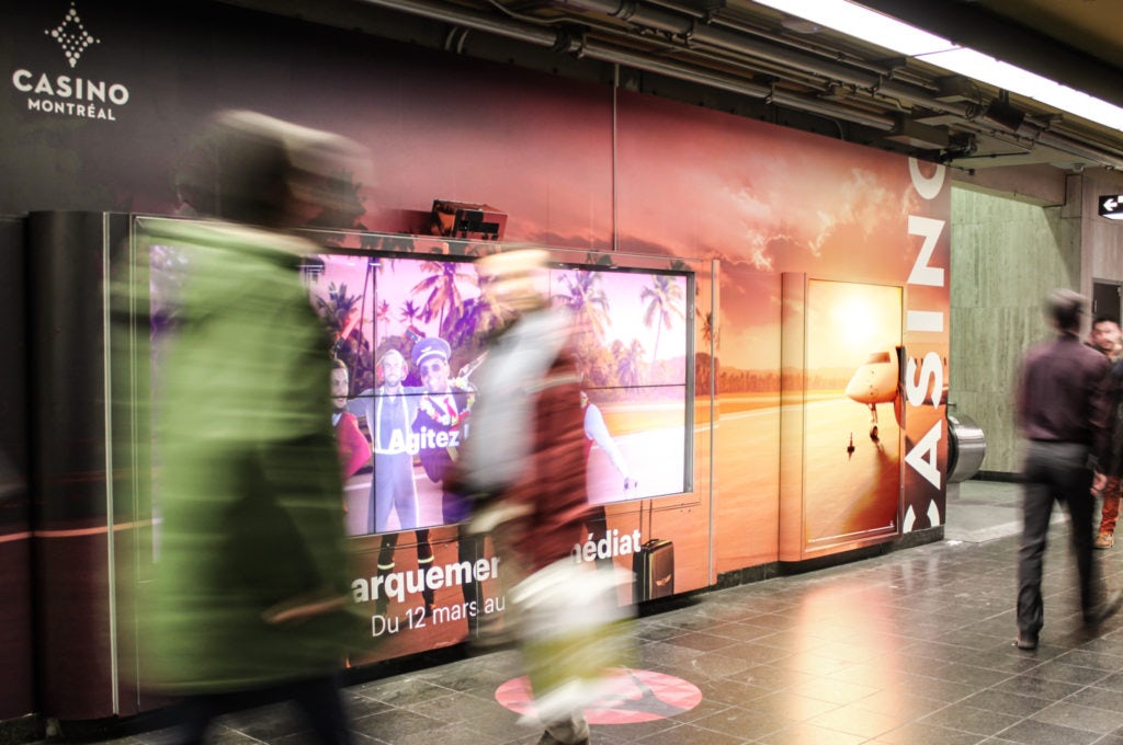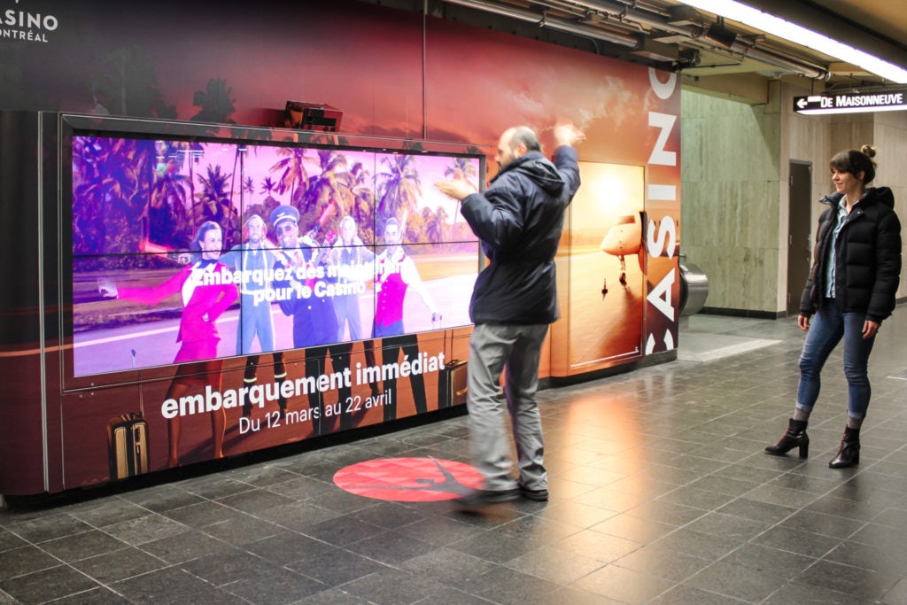 Le Casino de Montréal est en mode vacances et propose un embarquement immédiat pour le Sud! Astral a donc produit une campagne ludique à la station de métro McGill où les gens sont invités à agiter les bras pour embarquer dans la danse. Lorsque les passants marchent devant la murale, Gregory Charles – l’ambassadeur du Casino de Montréal – se met à jouer du ukulélé. Une pastille a été placée devant la murale numérique à la station de métro pour inciter les gens à interagir avec le panneau d’affichage. En agitant les bras ou en perfectionnant quelques pas de danse sur la pastille, les personnages entourant Gregory reproduisent les gestes en parfaite synchronisation. Au terme de la chorégraphie de 30 secondes dirigée par le participant, l’expérience prend fin et laisse place à un message invitant les gens au Casino.