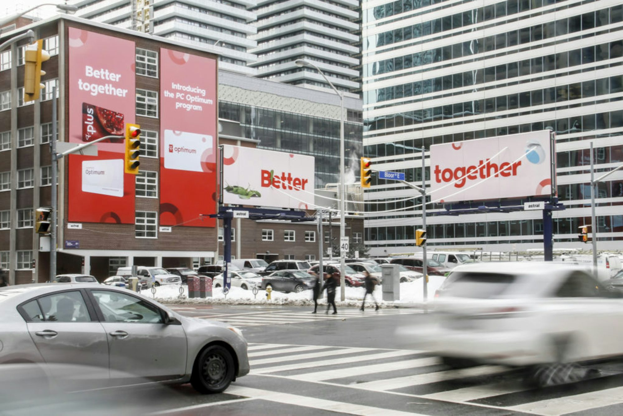 Afin de promouvoir la fusion des programmes de loyauté PC Plus et Shoppers Optimum, Loblaws a marqué le coup sur des panneaux d’affichage extérieur Astral à Toronto. Le concept « À deux, c’est mieux » a été exécuté en utilisant d’immenses fils de soie dentaire pour relier deux panneaux, tout en mettant l’emphase sur les murales qui se retrouvent côte à côte au coin des rues Church et Bloor.