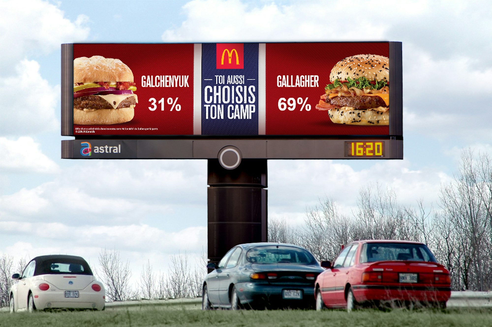 La campagne McJoueur utilisait la rivalité amicale des deux hockeyeurs en leur demandant de créer chacun un burger sur mesure et selon leurs goûts. Les partisans du Canadiens devaient ensuite se déplacer dans le McDonald’s le plus proche pour goûter le burger de leur choix. Désirant intensifier le débat dans la grande région de Montréal, McDonald’s a choisi les panneaux numériques grand format d’Astral Affichage pour montrer, en temps réel, la popularité quotidienne des deux burgers au niveau des ventes.