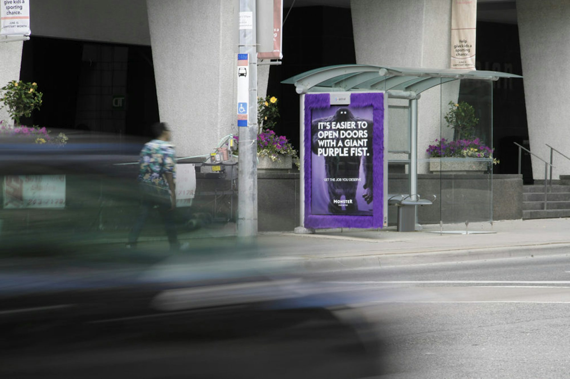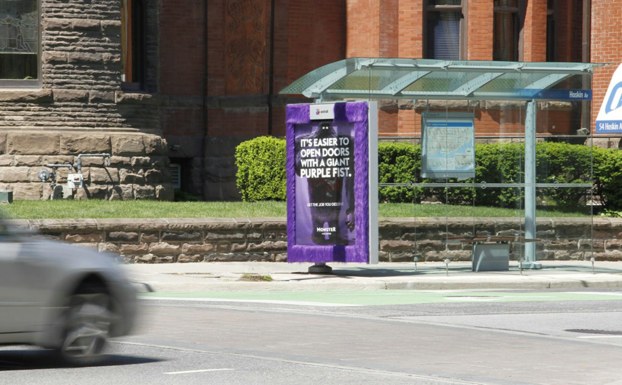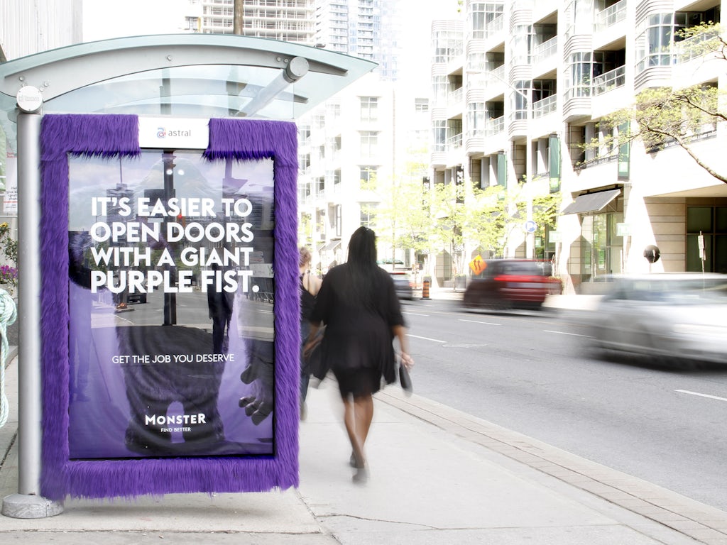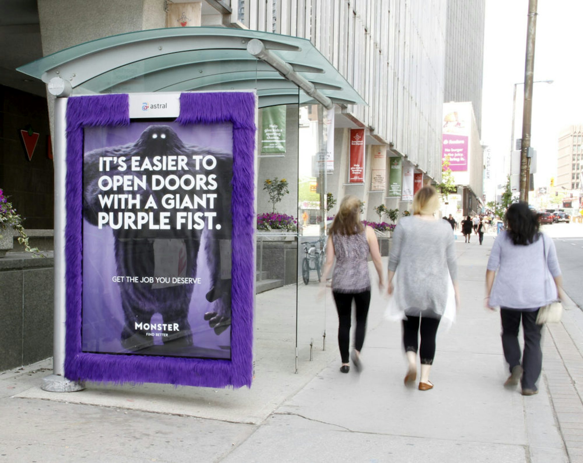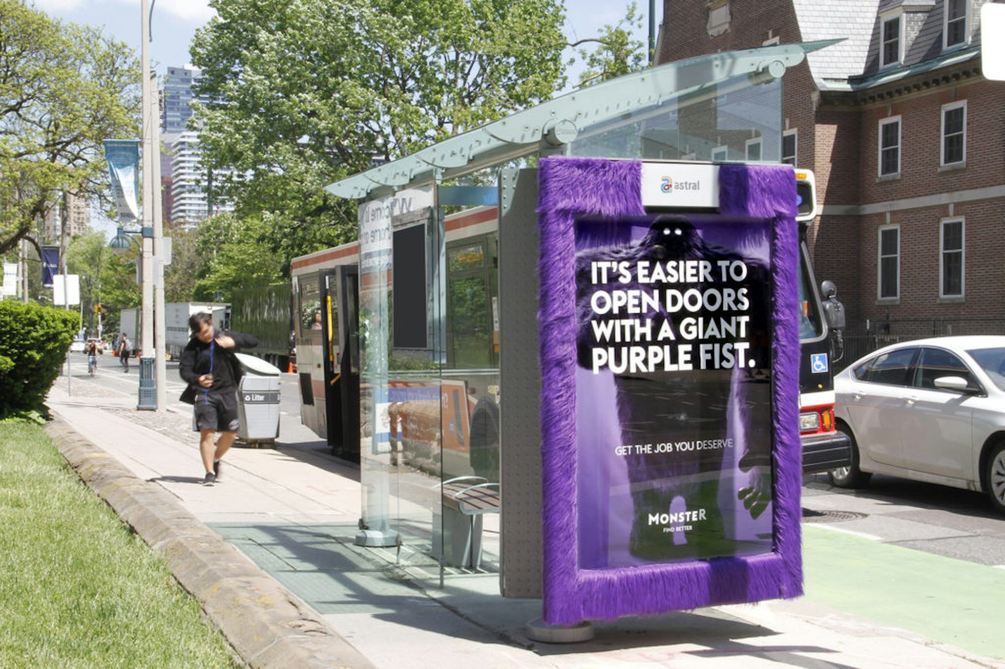 Le site de recherche d’emplois Monster.ca a choisi les abribus d’Astral Affichage à Toronto pour augmenter la notoriété de sa marque. Inspirées de sa mascotte, un monstre violet à poil long, les structures des faces publicitaires ont été enveloppées de poils mauves. Le résultat, très ludique, donnait l’impression que la mascotte prenait vie sur l’abribus et a attiré particulièrement l’attention des passants et des usagers des transports en commun. Une campagne ciblée en français s’est également décliné à Montréal sur des colonnes de rue.