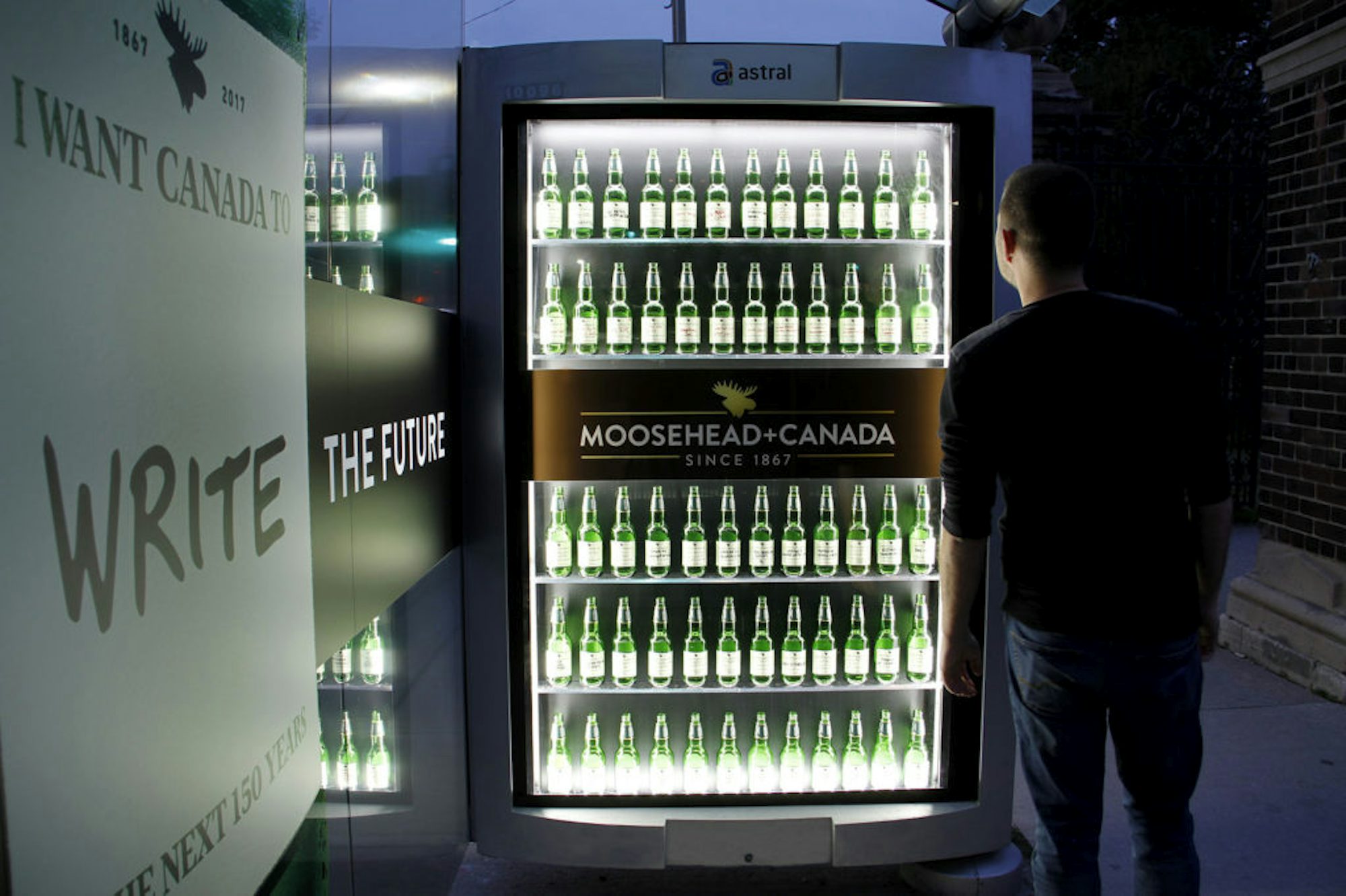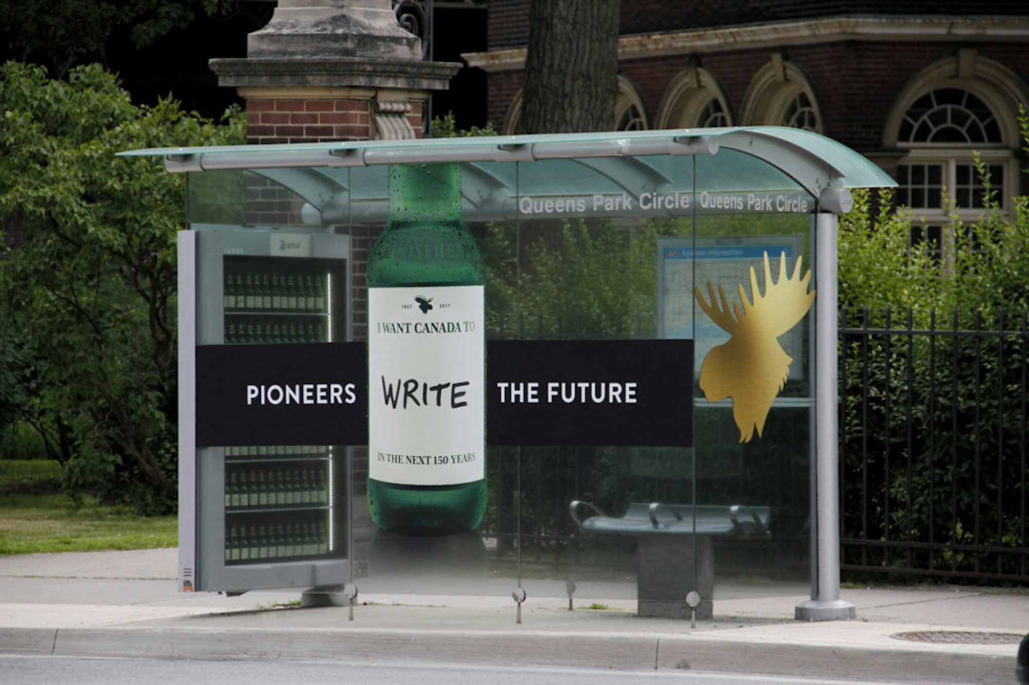 Astral Affichage a aidé Moosehead à élaborer la phase « invitation » de la campagne au niveau de la rue, grâce à des abribus particuliers qui mettaient en valeur des « bouteilles de l’avenir », édition fête du Canada. La face d’affichage a été convertie afin d’y insérer de vraies bouteilles. Offertes en quantité limitée, ces bouteilles de bière Moosehead avaient des étiquettes blanches, sur lesquelles les Canadiens étaient invités à écrire leur vision du Canada de demain, pour ensuite la partager sur les médias sociaux à l’aide du mot-clic #Outlast. Sur la partie extérieure de cette même face publicitaire, on pouvait voir la nouvelle bouteille standard de Moosehead, complètement reconçue.