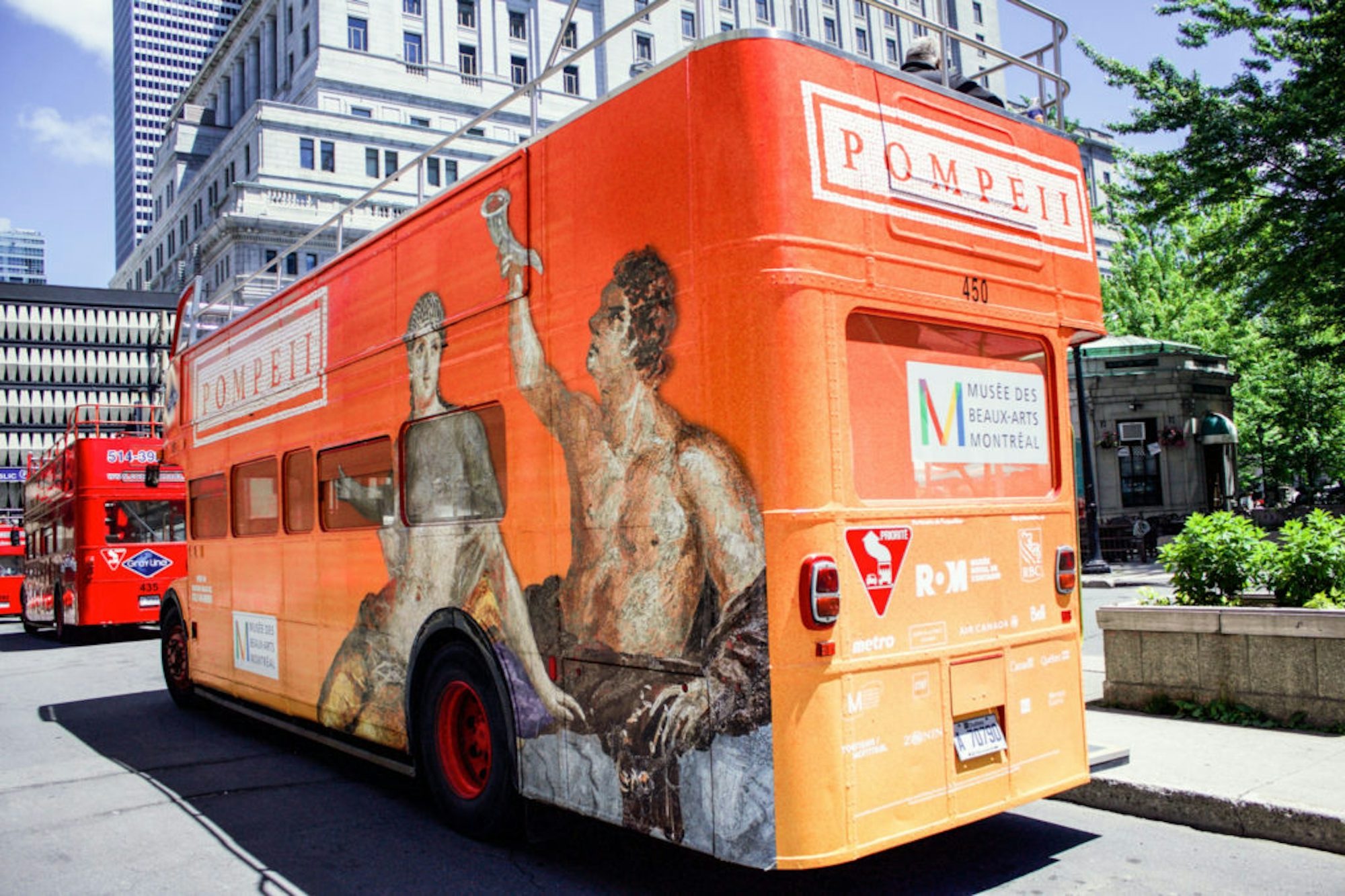 Le Musée des Beaux-Arts de Montréal met à profit le vaste espace d’affichage qu’offre le maquillage d’un autobus Double Decker pour attirer l’attention du public sur l’exposition Pompéi se tenant jusqu’en septembre 2016.
