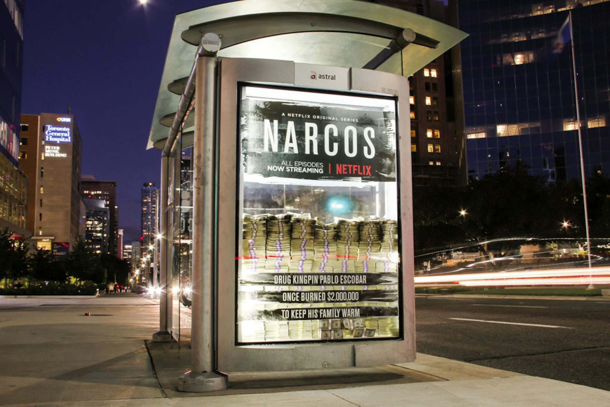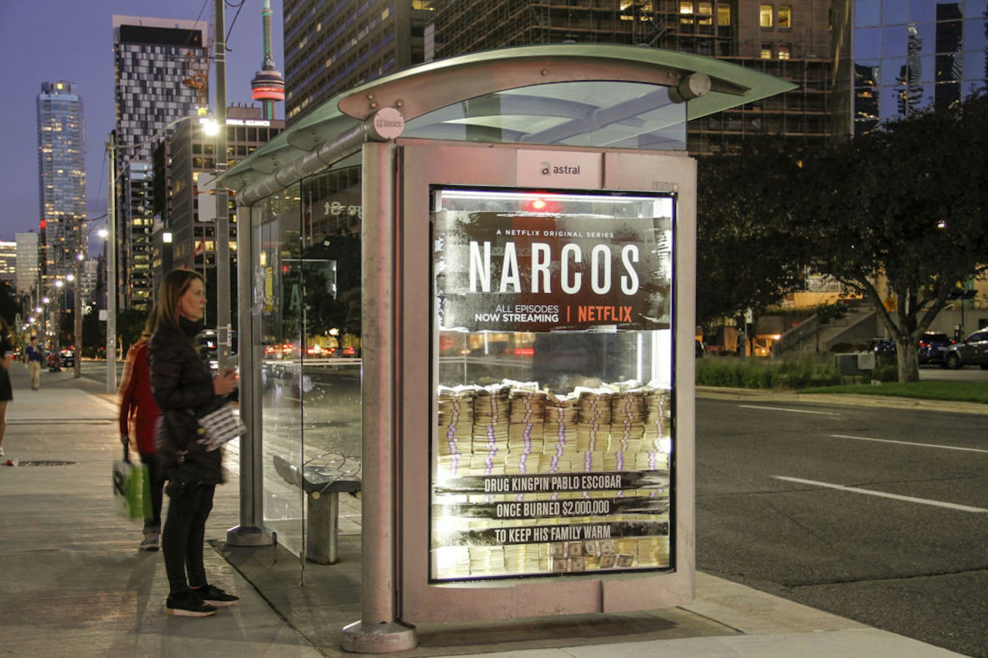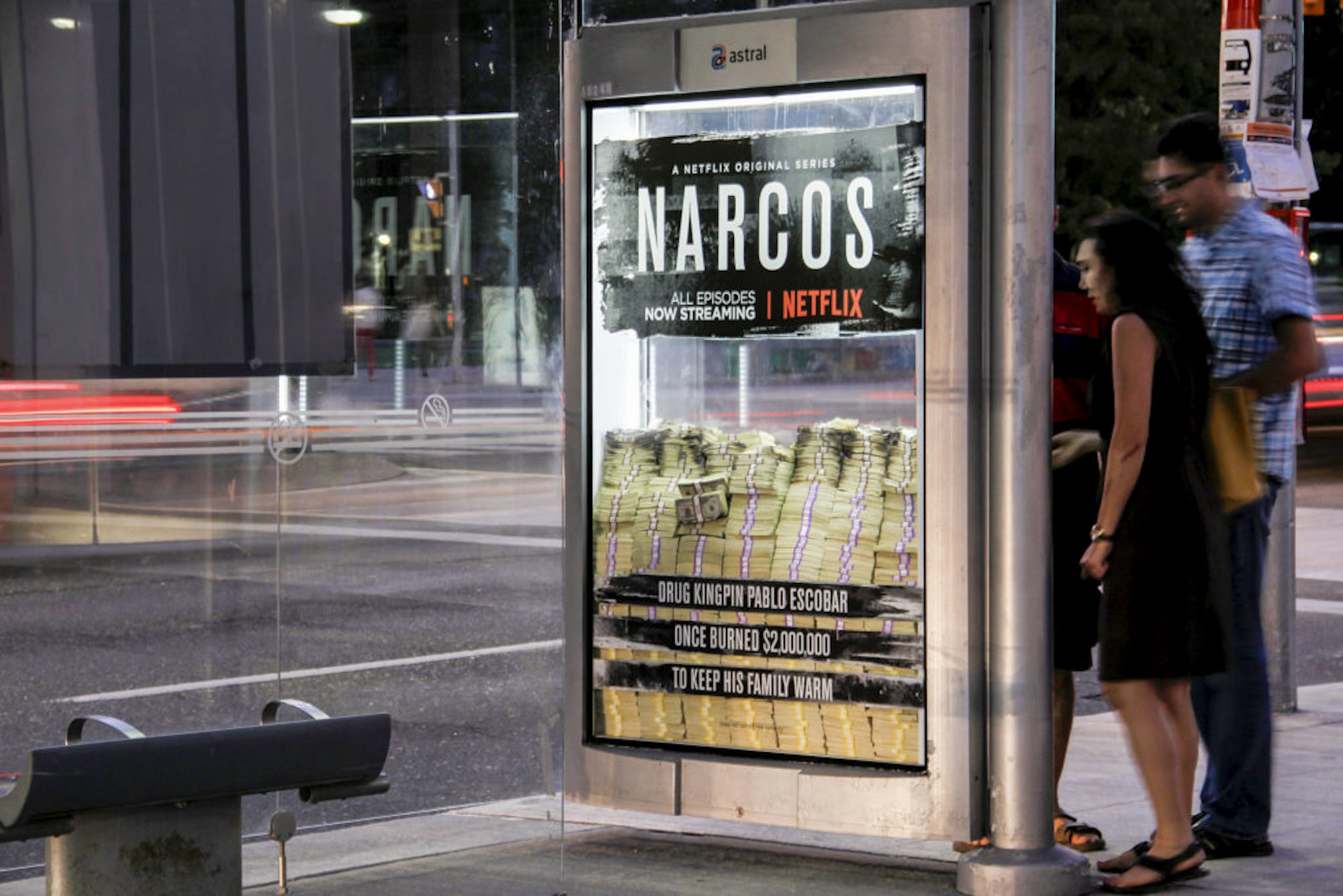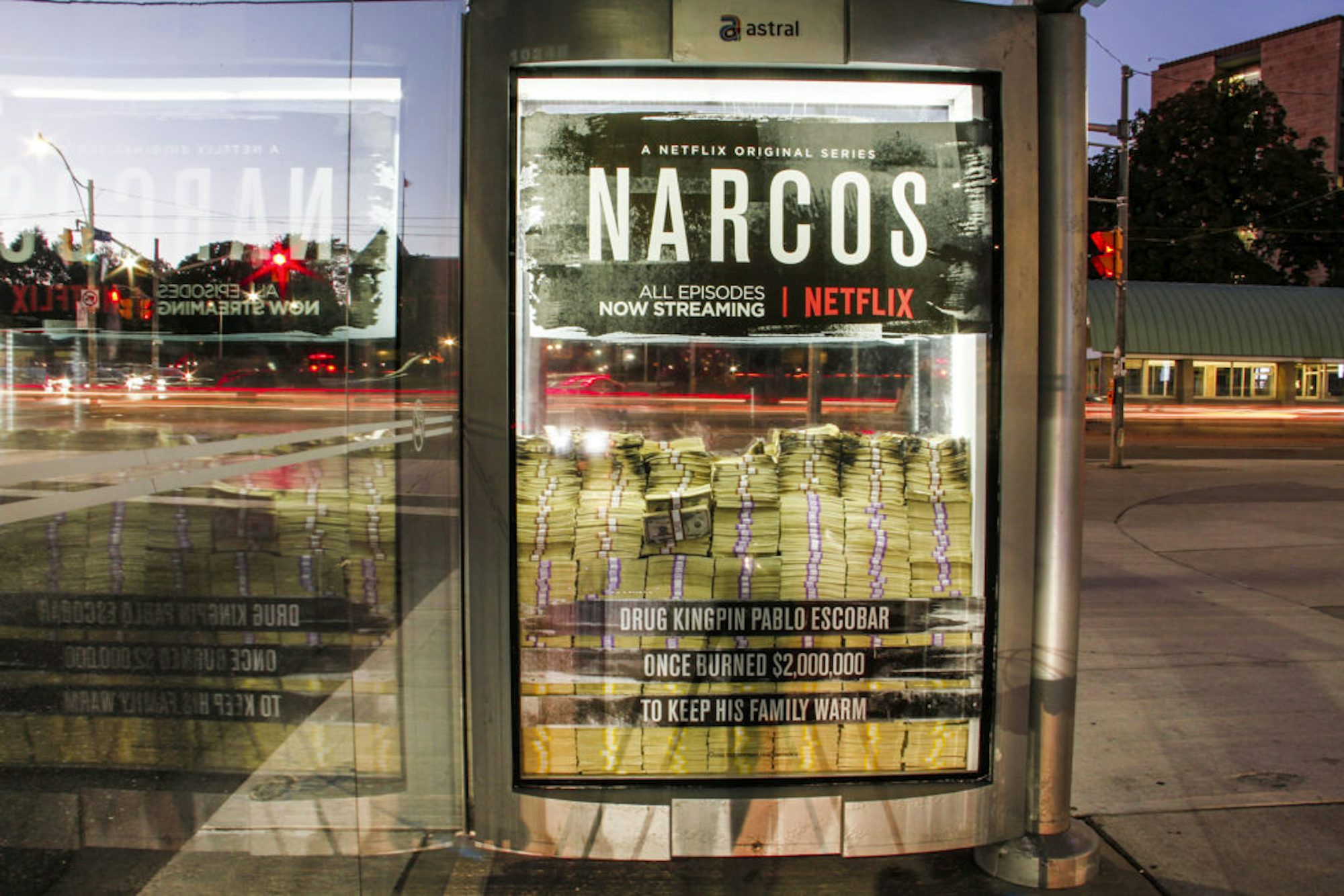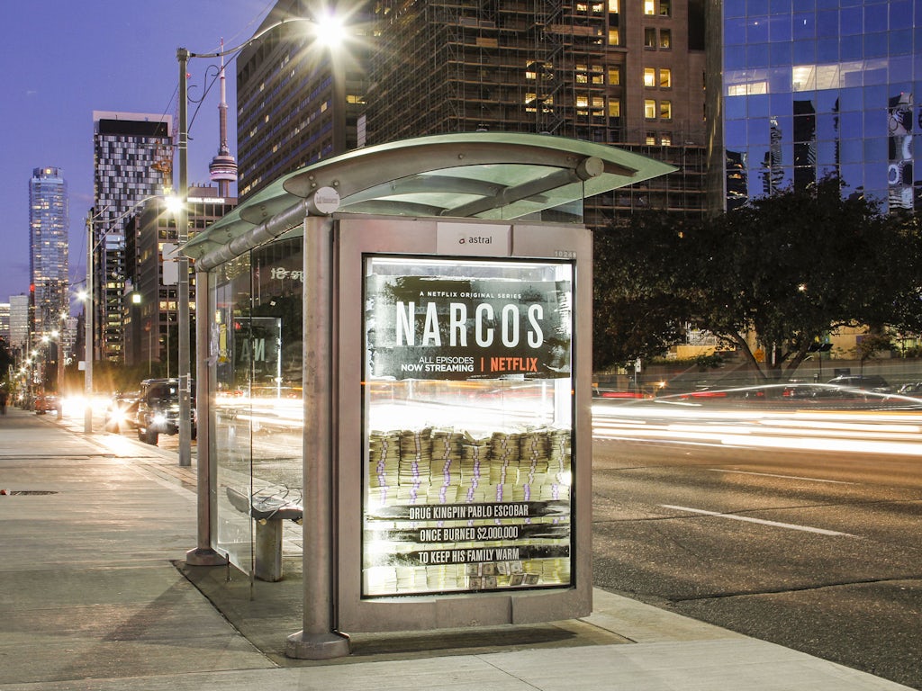 Netflix a utilisé les abribus de Toronto pour promouvoir la deuxième saison de sa série Narcos, qui raconte l’histoire du magnat de la drogue, Pablo Escobar. Exactement comme dans l’histoire, Escobar a déjà fait brûlé, littéralement, 2 000 000$ pour garder sa famille au chaud. Quatre abribus ont été spécifiquement sélectionnés pour leur grand achalandage quotidien et ont été remplis de 2 millions de dollars chacun. Les faces de chacun des abribus ont été spécialement agrandies pour s’assurer de bien voir l’argent. L’effet spectaculaire a beaucoup attiré l’attention, notamment sur les réseaux sociaux. Une personne était même convaincue que l’argent était réel!