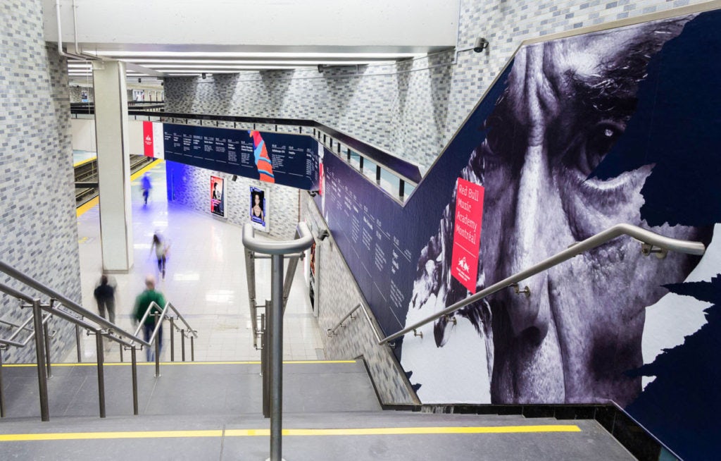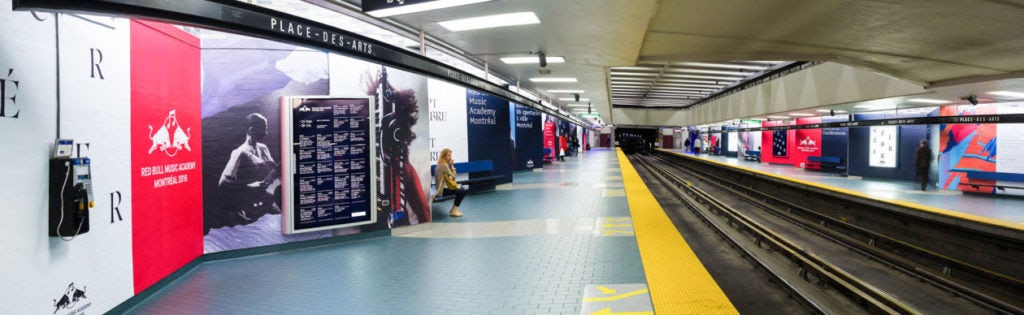 Pour fêter le 18ème anniversaire de la Red Bull Music Academy, un maquillage complet de 185 pieds fût installé sur tous les murs en angles longeant les quais de la station Place-des-Arts, et ce dans les deux directions. De nouveaux supports jamais exploités auparavant ont d’ailleurs été inclus dans le projet global et le rendement final, une dominance de la station, est à couper le souffle. S’ajoutent également une gigantesque murale de 68 pieds par 16 pieds sur le quai de la station Sherbrooke, en direction Montmorency, et plusieurs panoquais et lumiquais dans tout le réseau.