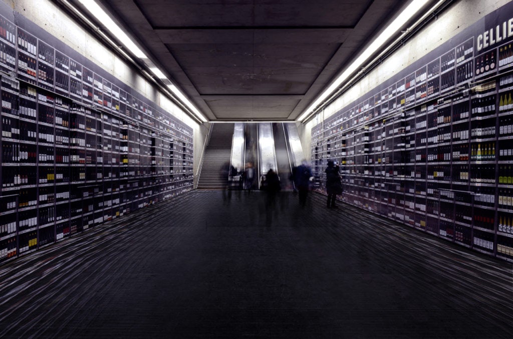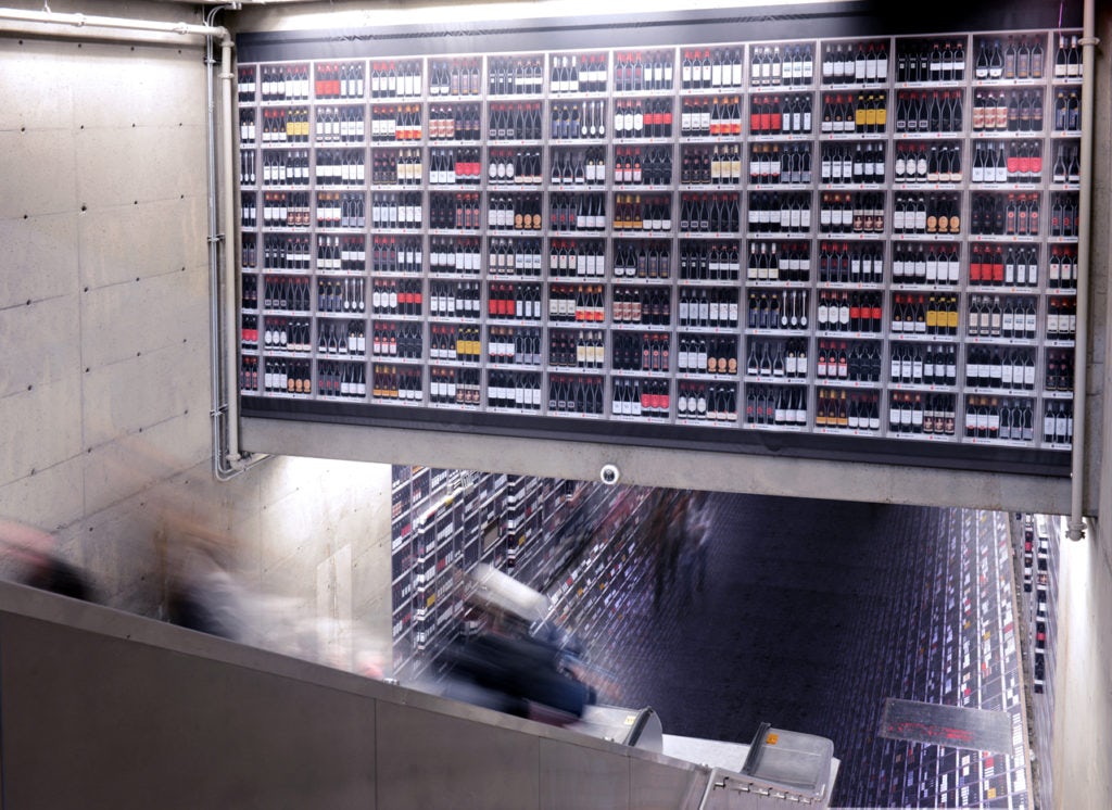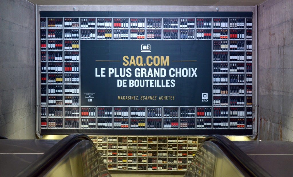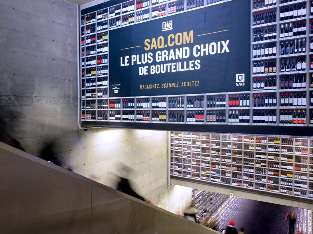 Sid Lee et la SAQ dévoilent une nouvelle installation située au 1 000 De la Gauchetière afin de mettre en valeur la grande quantité de produits offerte sur le SAQ.com avec une création trompe-l’œil où les passants ont littéralement l’impression de plonger dans un cellier à la profondeur infinie.