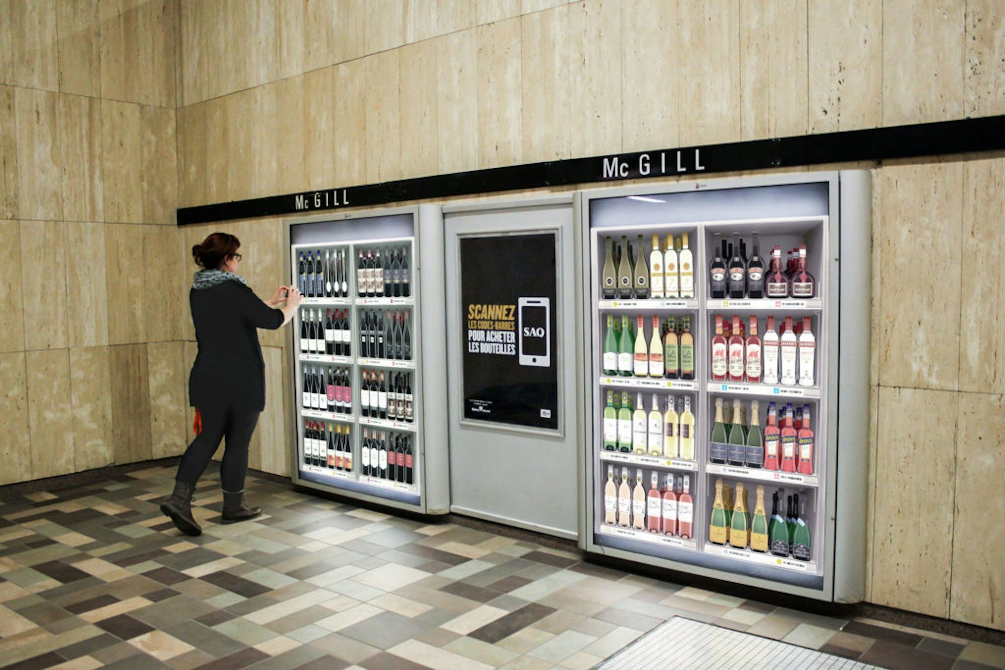 Le SAQ à transformé les murs de plusieurs stations en boutique virtuelle SAQ avec l’objectif de mettre de l’avant l’application mobile transactionnelle. Des code-barres fonctionnels permettent de s’informer sur les produits et d’acheter des bouteilles en temps réel. Ensuite, on peut aller les récupérer dans la succursale de notre choix ou les faire livrer à la maison.