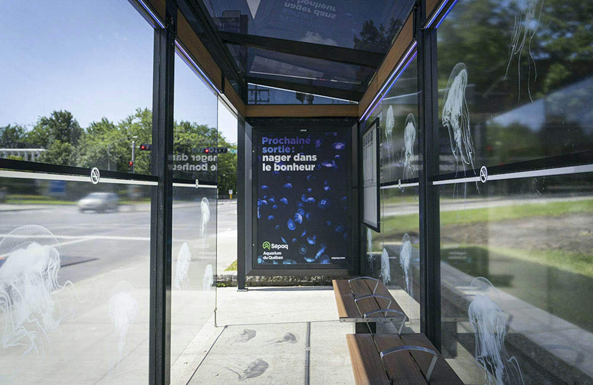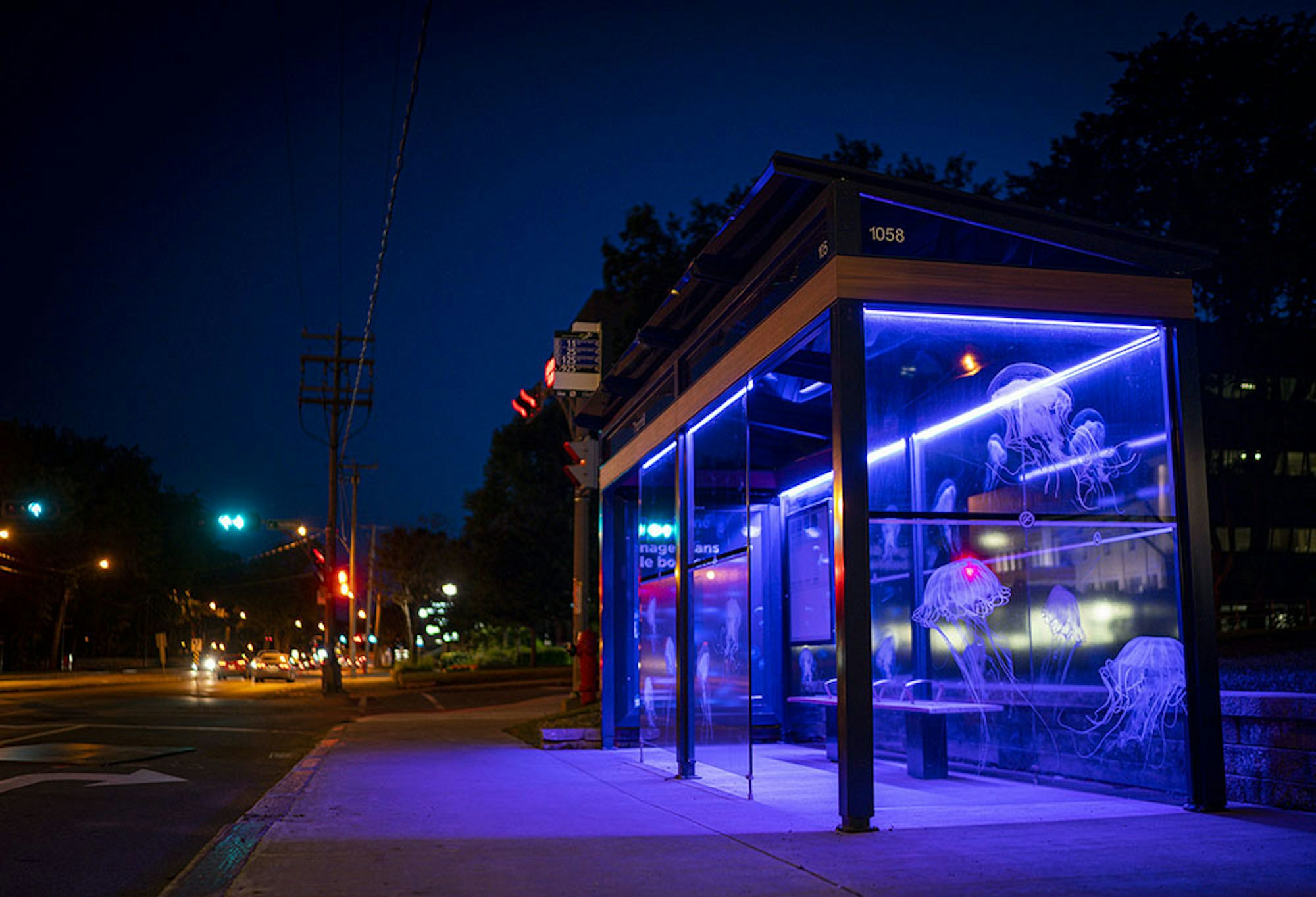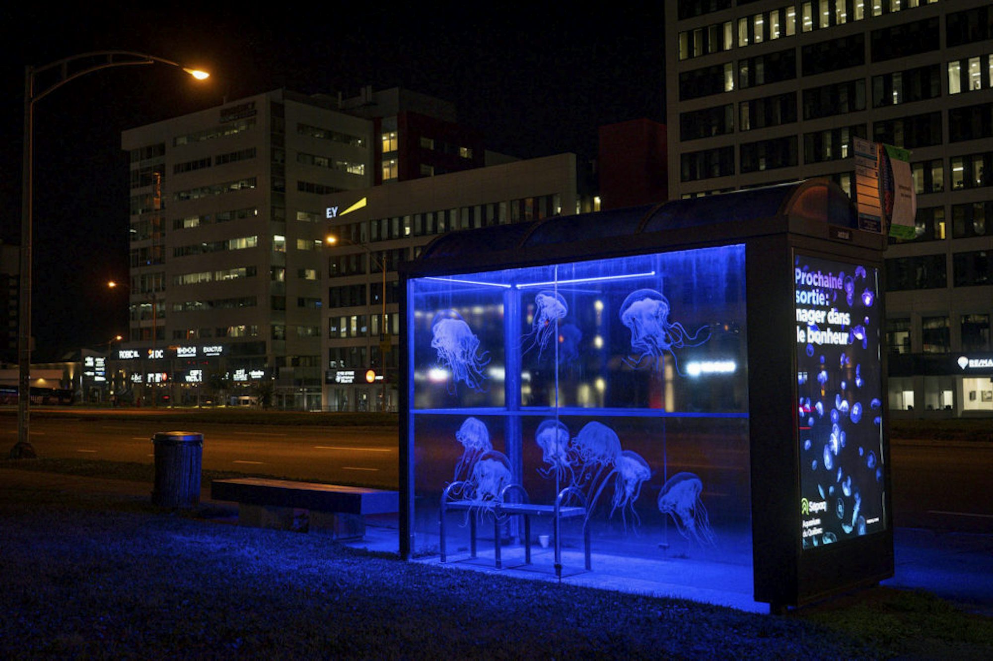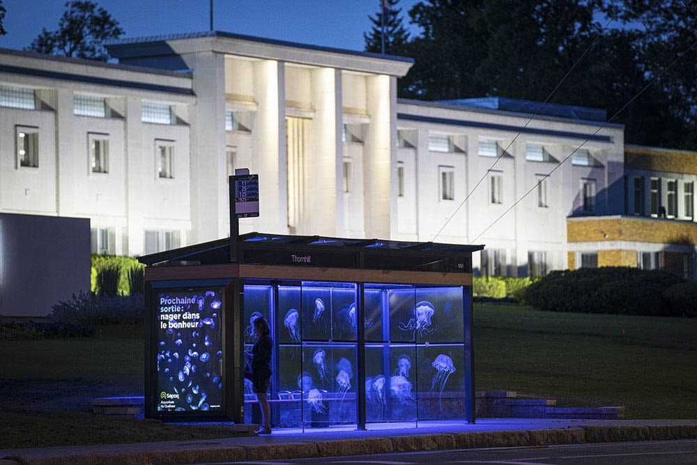Des abribus de la ville de Québec ont ainsi été transformés en aquarium à méduses! Un éclairage ambiant aux LED ultra-violets – une source de lumière couramment utilisée dans les aquariums de ce type d’animal marin – fut installé dans les abribus, donnant ainsi l’impression aux usagers d’être littéralement plongés dans un aquarium avec ces captivantes créatures phosphorescentes!