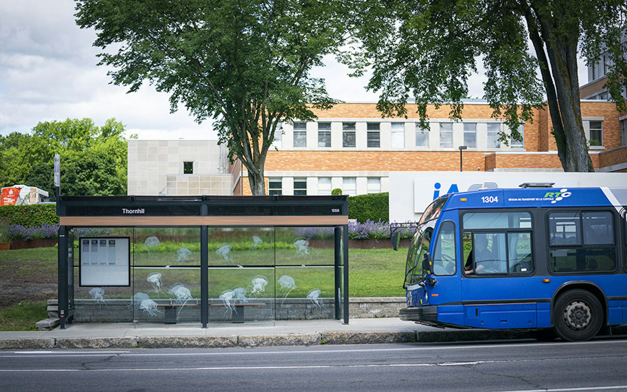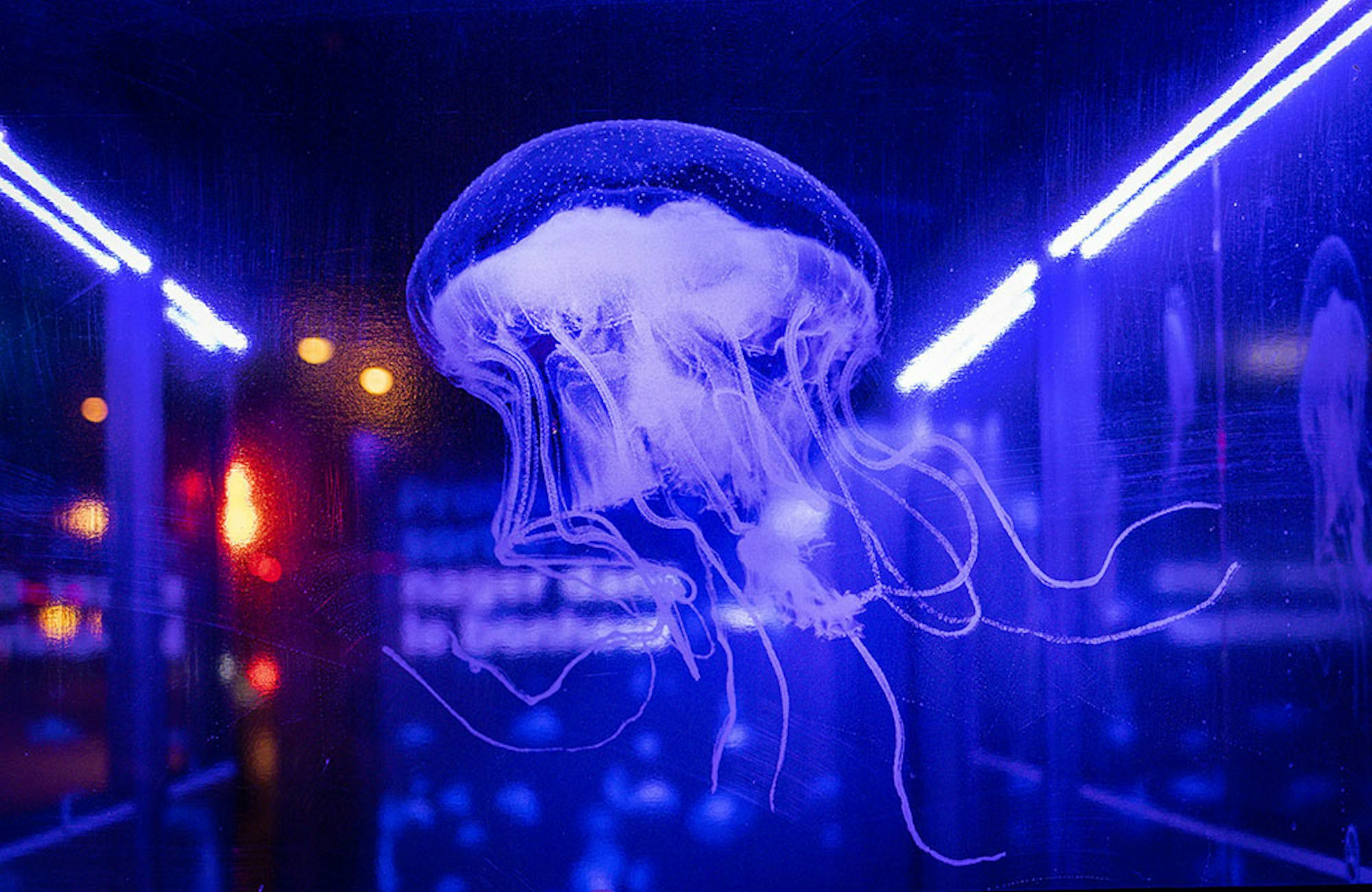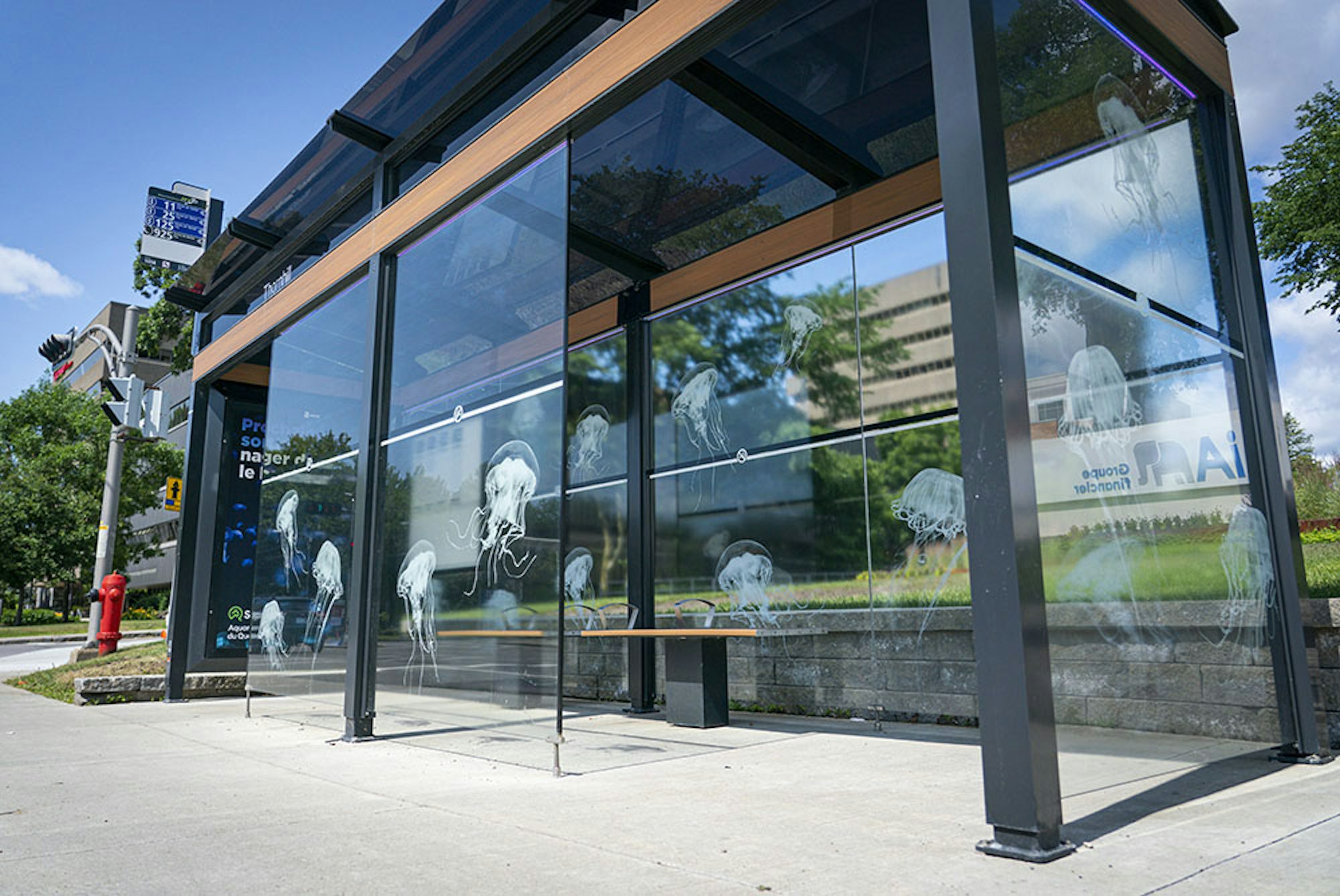 Des abribus de la ville de Québec ont ainsi été transformés en aquarium à méduses! Un éclairage ambiant aux LED ultra-violets – une source de lumière couramment utilisée dans les aquariums de ce type d’animal marin – fut installé dans les abribus, donnant ainsi l’impression aux usagers d’être littéralement plongés dans un aquarium avec ces captivantes créatures phosphorescentes!