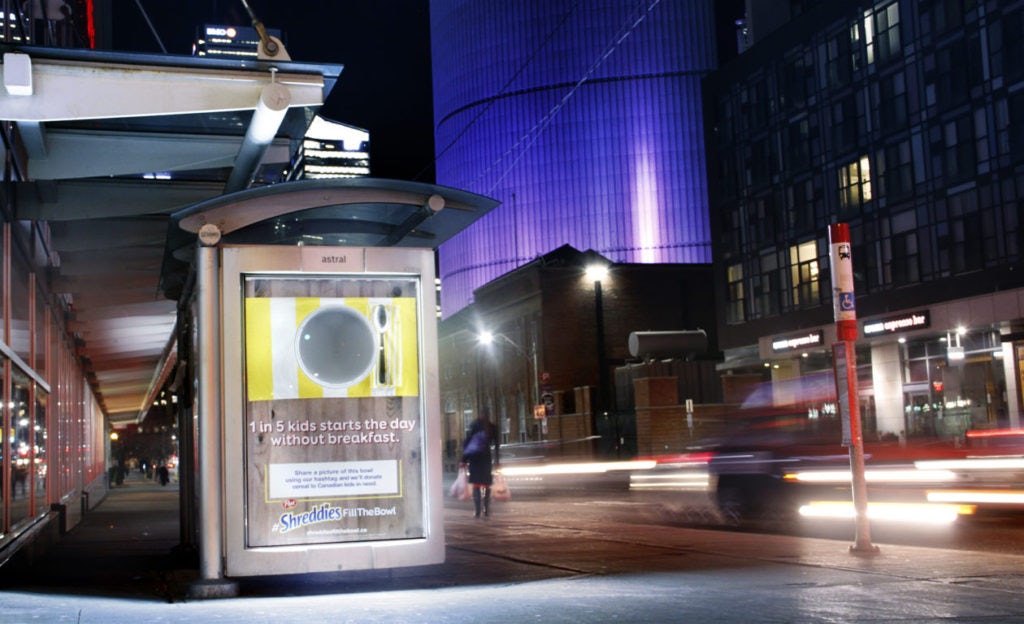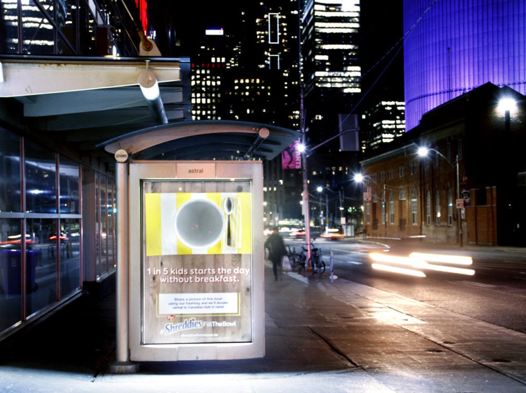 Afin de promouvoir ses efforts de bienfaisance, Shreddies présentait des bols vides dans certains abribus d’Astral à Toronto. Ces trois exécutions spéciales affichaient un bol vide avec une cuillère sur un napperon, le tout disposé sur une table. Les consommateurs étaient invités à prendre une photo des bols vides et à la partager sur Facebook ou Instagram avec le mot-clic #ShreddiesFillTheBowl. Pour chaque photo mise en ligne, Shreddies s’engageait à donner l’équivalent de 10 bols de céréales à des organismes de bienfaisance au Canada, offrant ainsi le petit déjeuner à des enfants des quatre coins du pays.