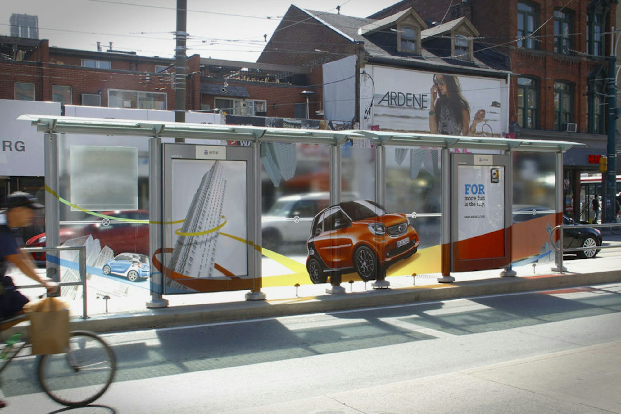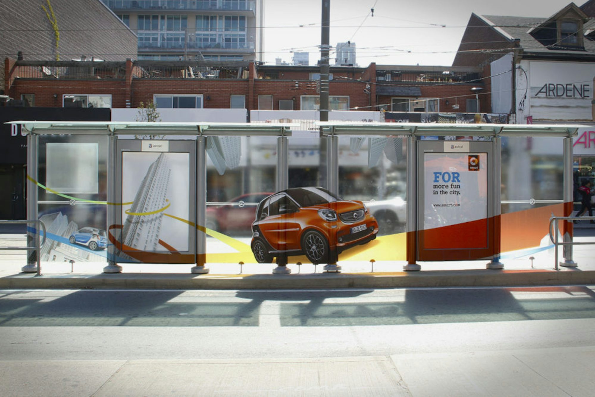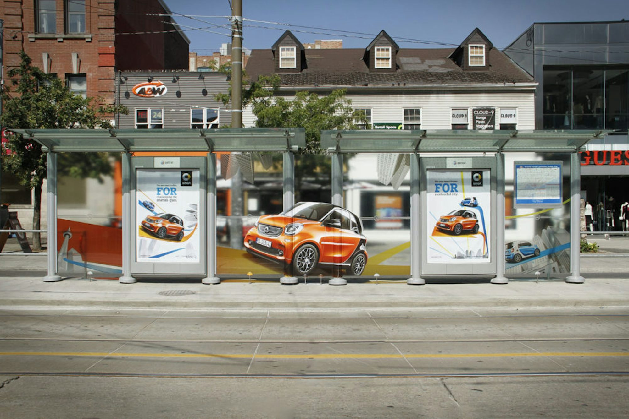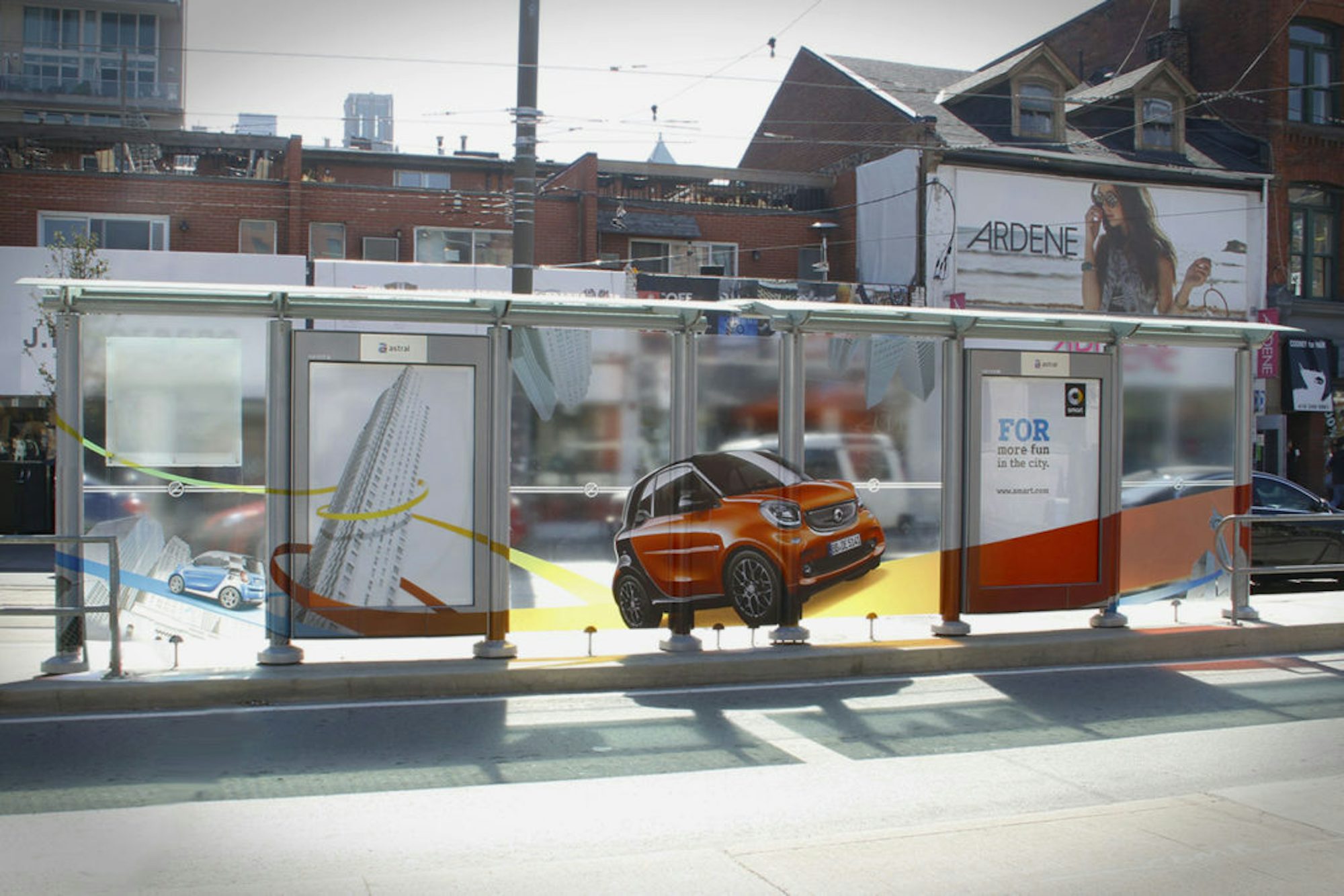 Plateforme de tramway entièrement recouverte de décalques transparents qui recouvrent les panneaux publicitaires et les vitres. On peut y voir une voiture Smart au centre, entre les panneaux, des deux côtés de la plateforme.