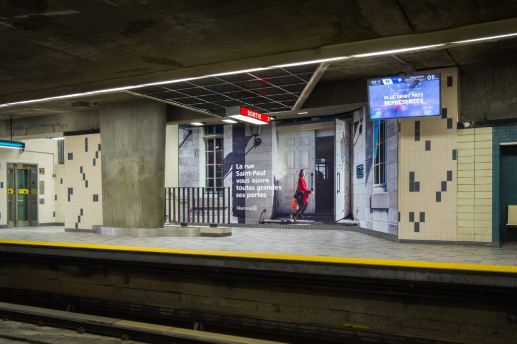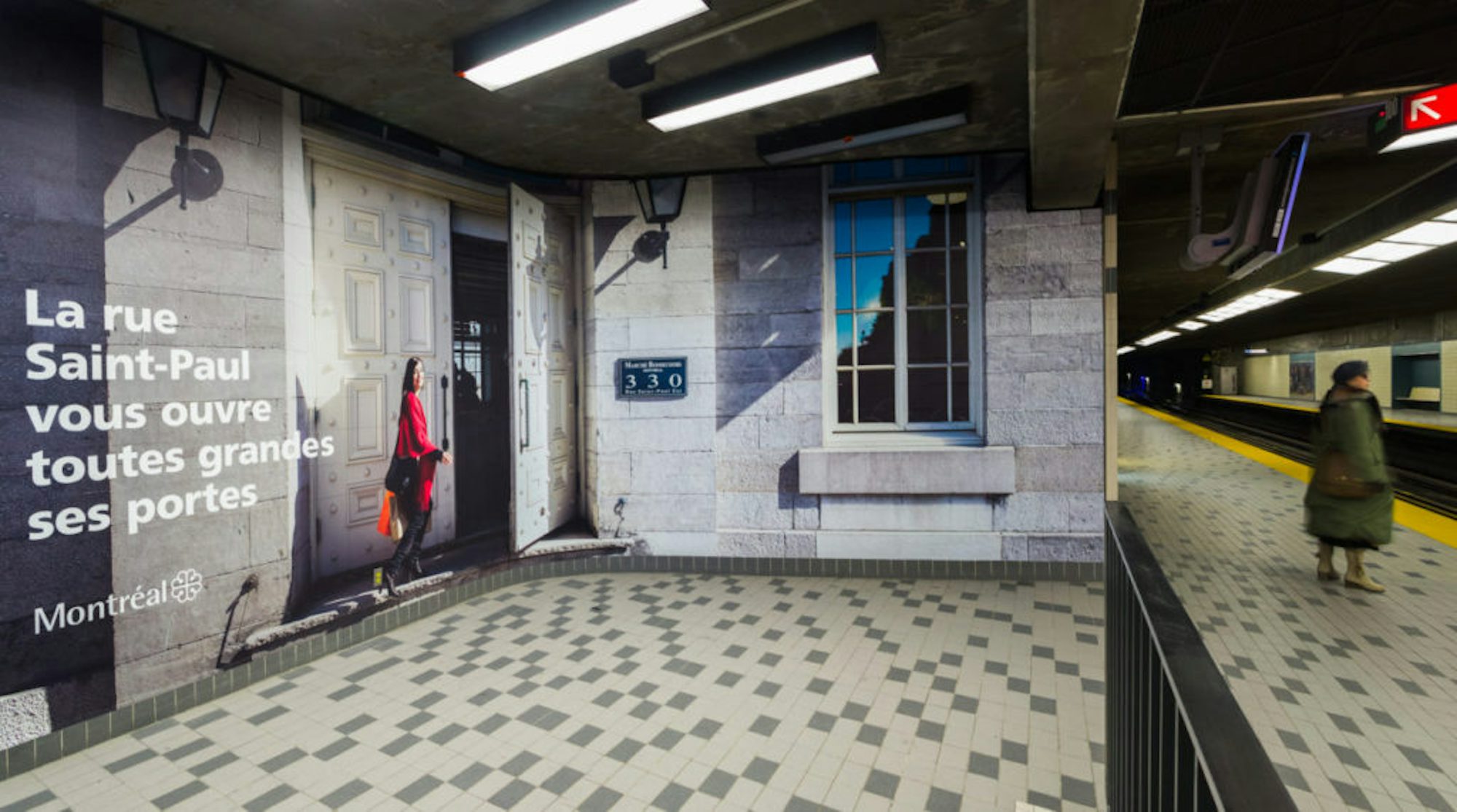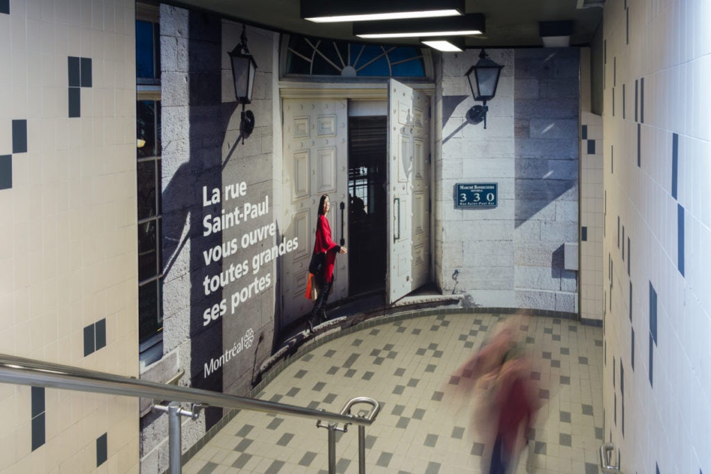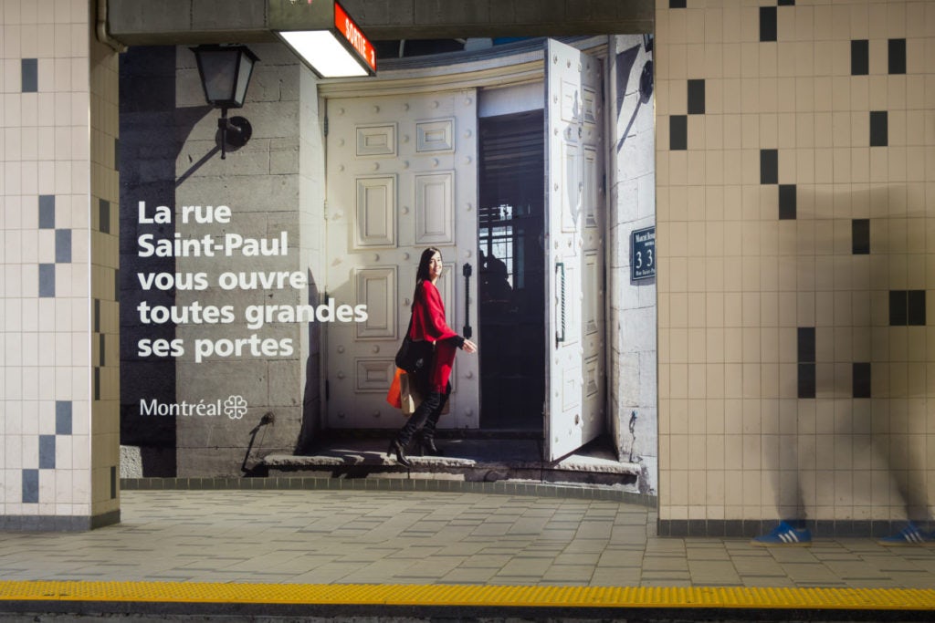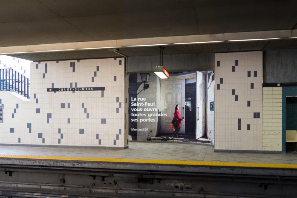 La Ville de Montréal a fait installer deux murales dans la station de métro Champ-de-Mars pour promouvoir la rue St-Paul et ses commerces. L’intégration des murales dans l’environnement créait une illusion d’optique sans faille qui donnait l’impression de se balader sur la rue St-Paul.