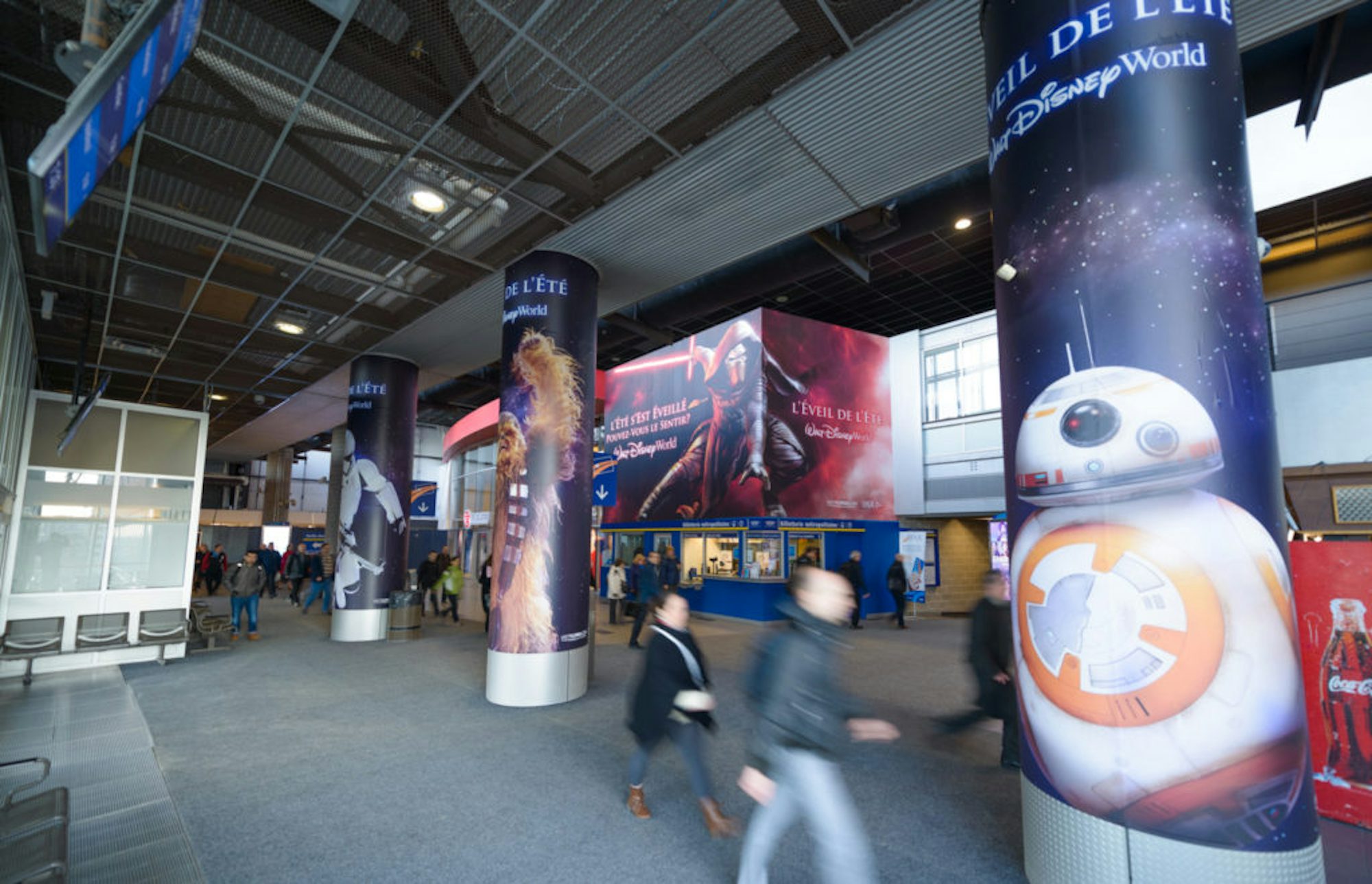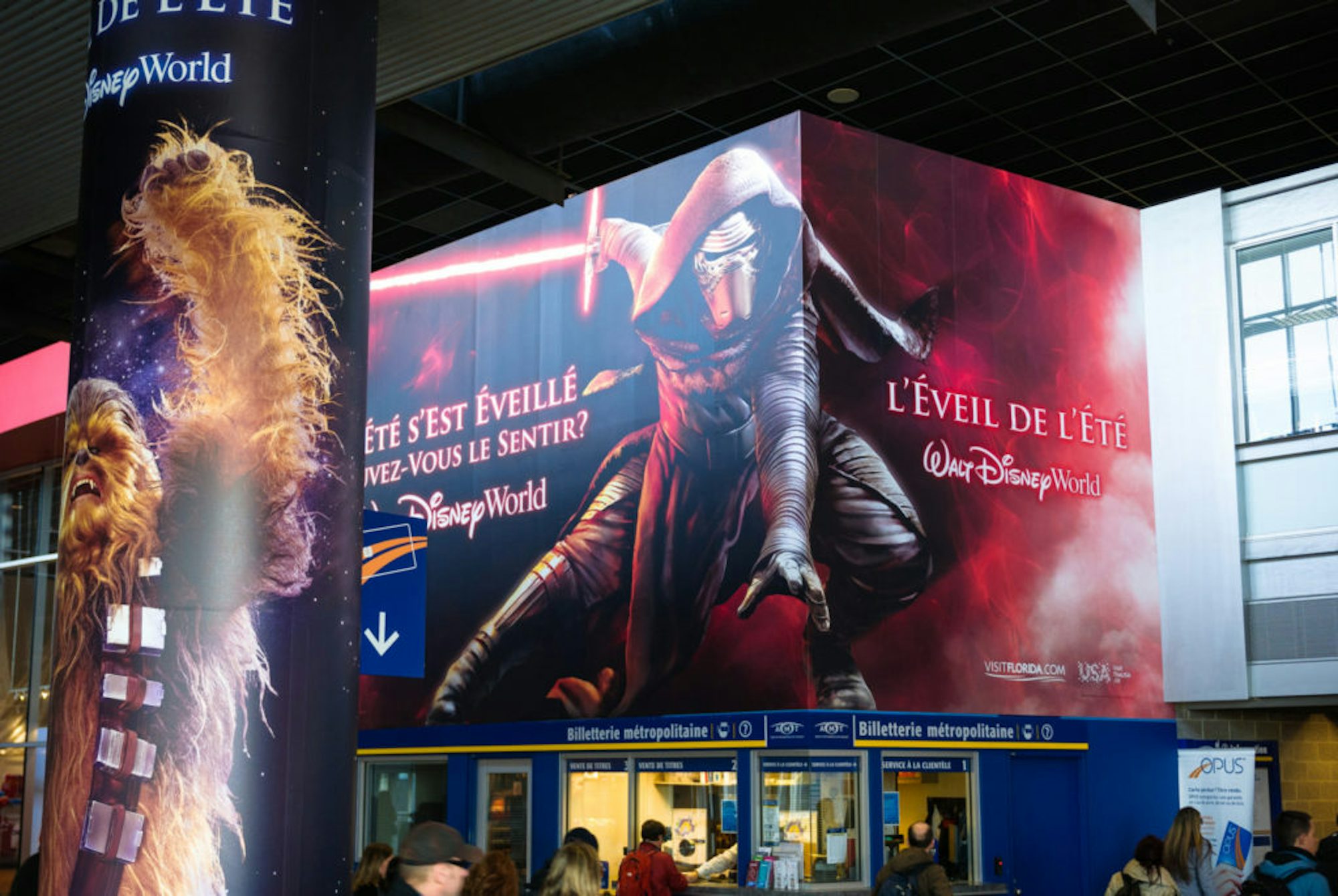 Disney Parks a conçu 2 superpanneaux mettant en vedette Raiponce, avec ses longs cheveux en extension, et « Star Wars » avec des extensions lumineuses 3D en forme d’épées laser. La campagne Star Wars a également dominé la gare Lucien-L’allier avec 3 colonnes, une murale extérieure, deux grandes murales et des affiches à l’intérieur des trains.