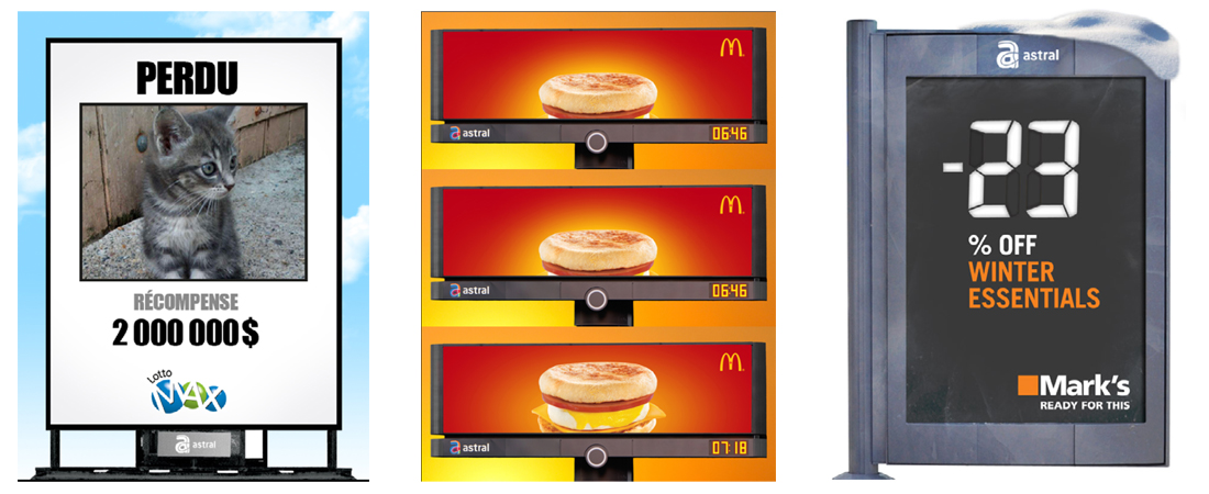 Astral Out of Home, a division of Bell Media, is one of Canada’s leading out-of-home advertising companies with over 9,500 advertising faces strategically located in the Québec, Ontario, Alberta and British Columbia markets. Driving innovation on one of the country’s most dynamic media platforms, Astral Out of Home is committed to staying at the forefront of the latest technological trends, offering advertisers the opportunity to deliver powerful messages that engage and connect with consumers. For more details, visit bellmedia.ca.