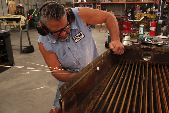 (L-R:) Automotive mastermind Steve Darnell cutting a grill shell; Welder Up team discussing build