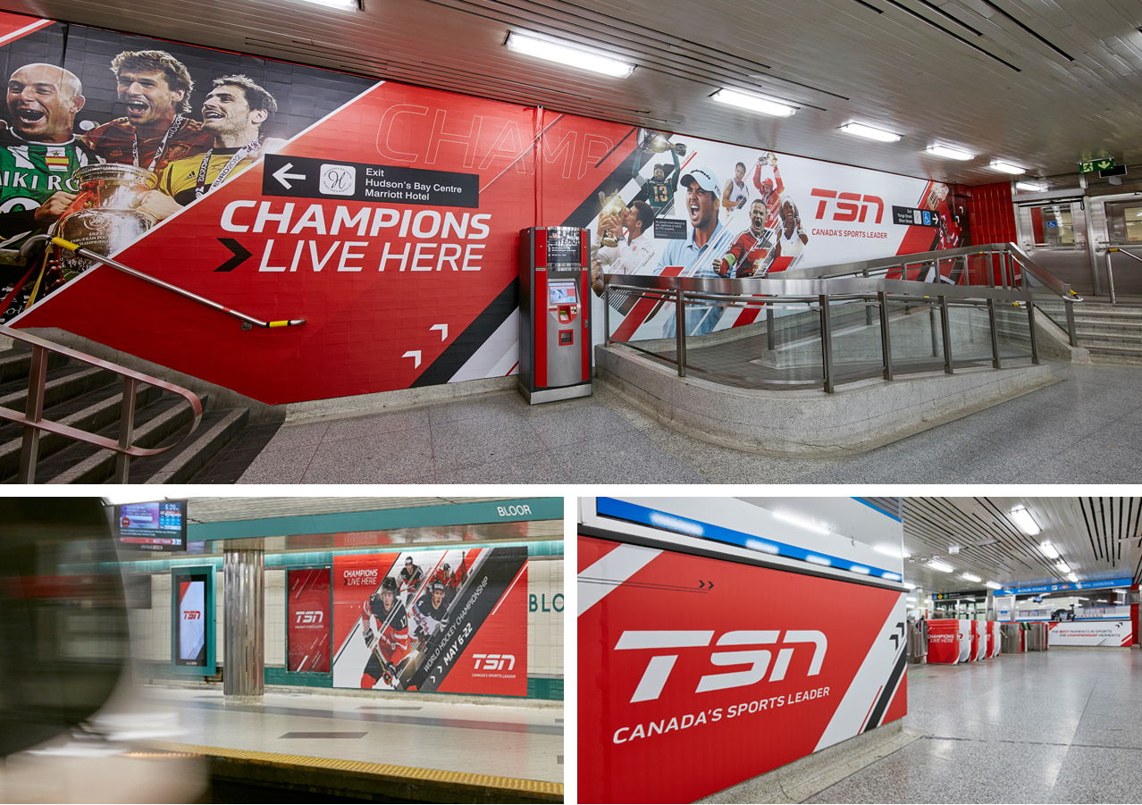 Featuring 178 pieces of unique creative installed at Canada’s busiest subway station for the next month, the total station domination is part of TSN’s ongoing CHAMPIONS LIVE HERE campaign that highlights the network’s deep and diverse roster of championship events. “Our CHAMPIONS LIVE HERE campaign is all about the moments of consequence that define the TSN experience,” said Stewart Johnston, President of TSN. “Toronto is a city that lives and breathes sports, and our campaign underscores just two of the more than 60 iconic championships that Canadians can experience on TSN.” “As part of TSN’s larger CHAMPIONS LIVE HERE marketing strategy, our subway domination really works as a one-two punch: it features high-impact visuals on a grand scale, while targeting hundreds of thousands of TTC users at Canada’s busiest subway station,” said Jon Arklay, Senior Vice-President, Bell Media Agency. “Together the visuals and high-profile location effectively drive home TSN’s CHAMPIONS LIVE HERE narrative in a very powerful way.” By the Numbers Installed over the course of two days by a 20-member crew, TSN’s CHAMPIONS LIVE HERE outdoor ad campaign at the Yonge-Bloor subway station features the following 178 pieces of unique creative:About TSN TSN is Canada’s Sports Leader and #1 specialty network. With a broad portfolio of multimedia sports assets, Champions Live Here as TSN delivers world-class content across its industry-leading platforms including five national television feeds, TSN.ca, TSN GO, and TSN Radio stations across the country. With more championship events than any broadcaster in the country, TSN’s deep and diverse roster of live sports programming includes the Grey Cup, IIHF World Junior Championship, Hockey Canada events, CFL, NFL, NBA, MLS, Toronto Maple Leafs, Ottawa Senators, Winnipeg Jets, Season of Champions Curling, FIFA World Cup, UEFA Euro 2016, MLB, Barclays Premier League, Golf’s Majors, NASCAR, F1, Grand Slam Tennis, NCAA March Madness, and Skate Canada and Rugby Canada events. TSN is a division of Bell Media, which is part of BCE Inc. (TSX, NYSE: BCE), Canada’s largest communications company.